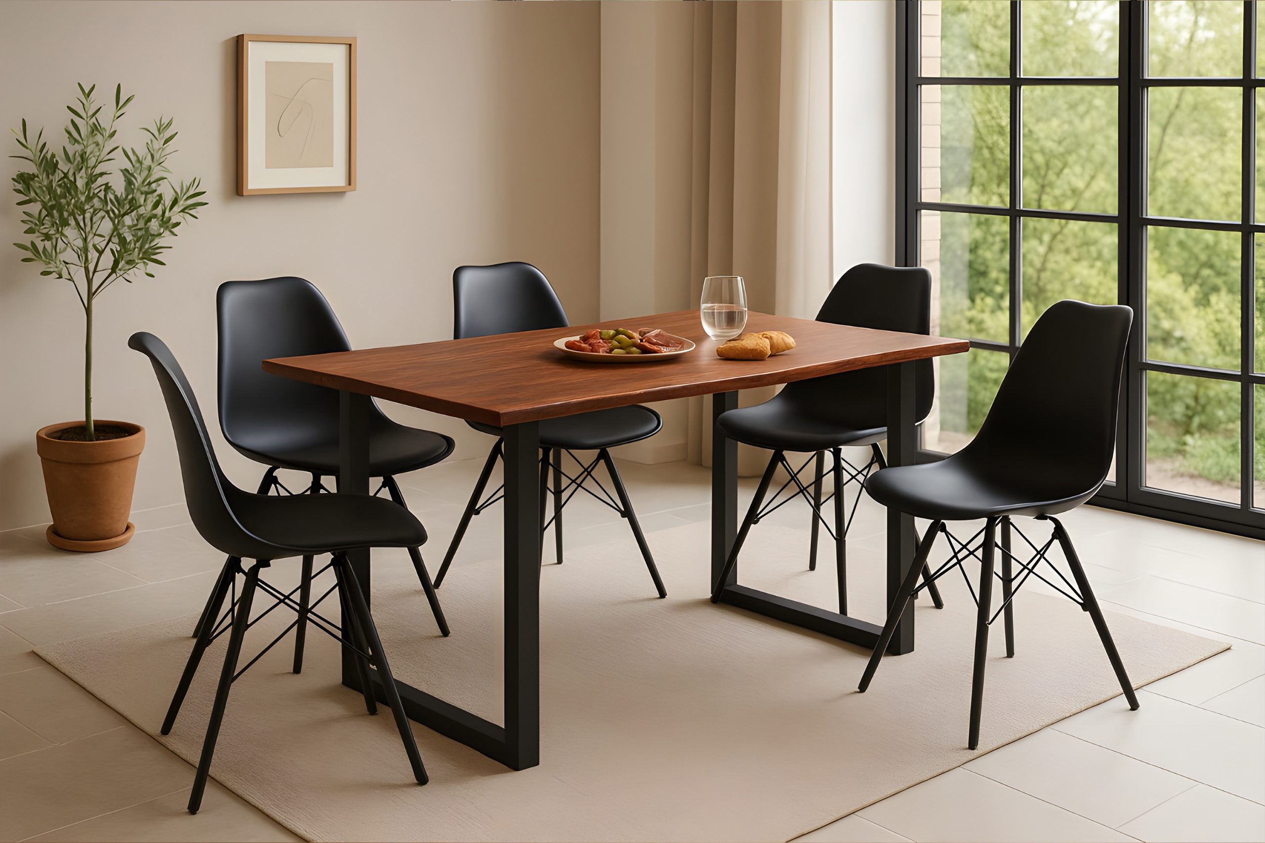 Das massive U-Gestell aus Eisen, schwarz lackiert, bildet einen modernen Kontrast zum natürlichen Holz. Es steht für Standfestigkeit, klare Linienführung und langlebige Funktionalität – ganz gleich, ob Sie den Holztisch täglich zum Essen, Arbeiten oder als Mittelpunkt im Familienleben nutzen.