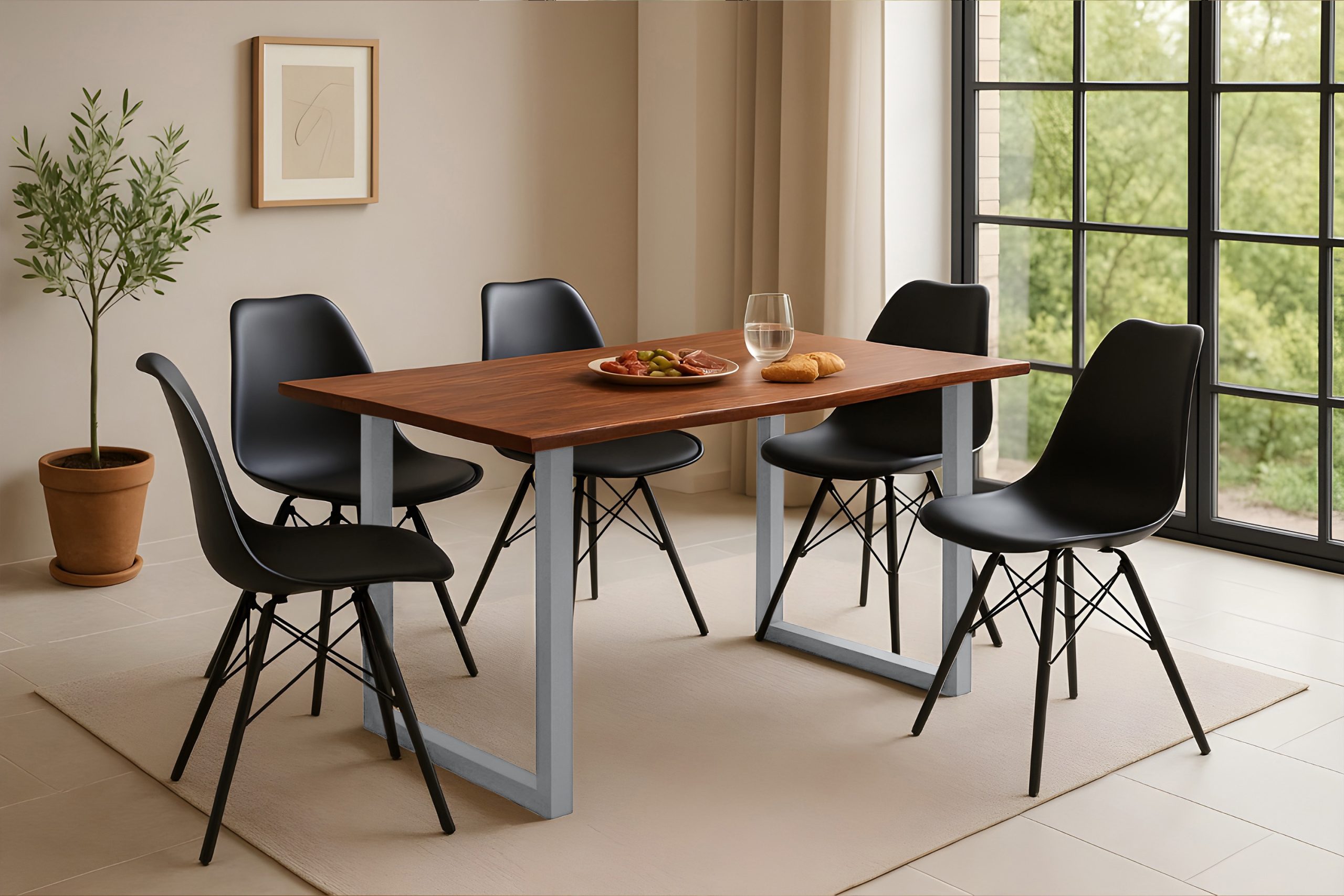 Das massive U-Gestell aus Eisen, silber lackiert, bildet einen modernen Kontrast zum natürlichen Holz. Es steht für Standfestigkeit, klare Linienführung und langlebige Funktionalität – ganz gleich, ob Sie den Holztisch täglich zum Essen, Arbeiten oder als Mittelpunkt im Familienleben nutzen.