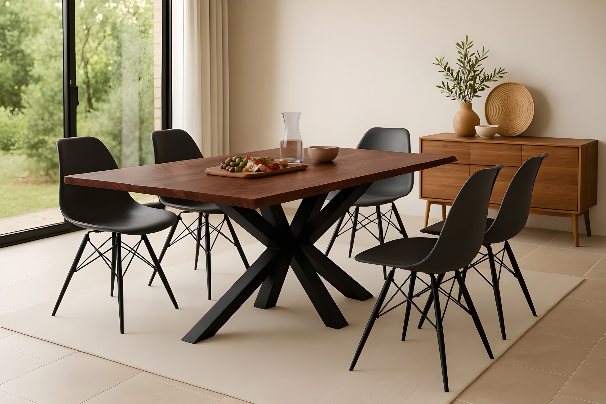 Das massive Spider-Gestell aus Eisen, schwarz lackiert, bildet einen modernen Kontrast zum natürlichen Holz. Es steht für Standfestigkeit, klare Linienführung und langlebige Funktionalität – ganz gleich, ob Sie den Holztisch täglich zum Essen, Arbeiten oder als Mittelpunkt im Familienleben nutzen.