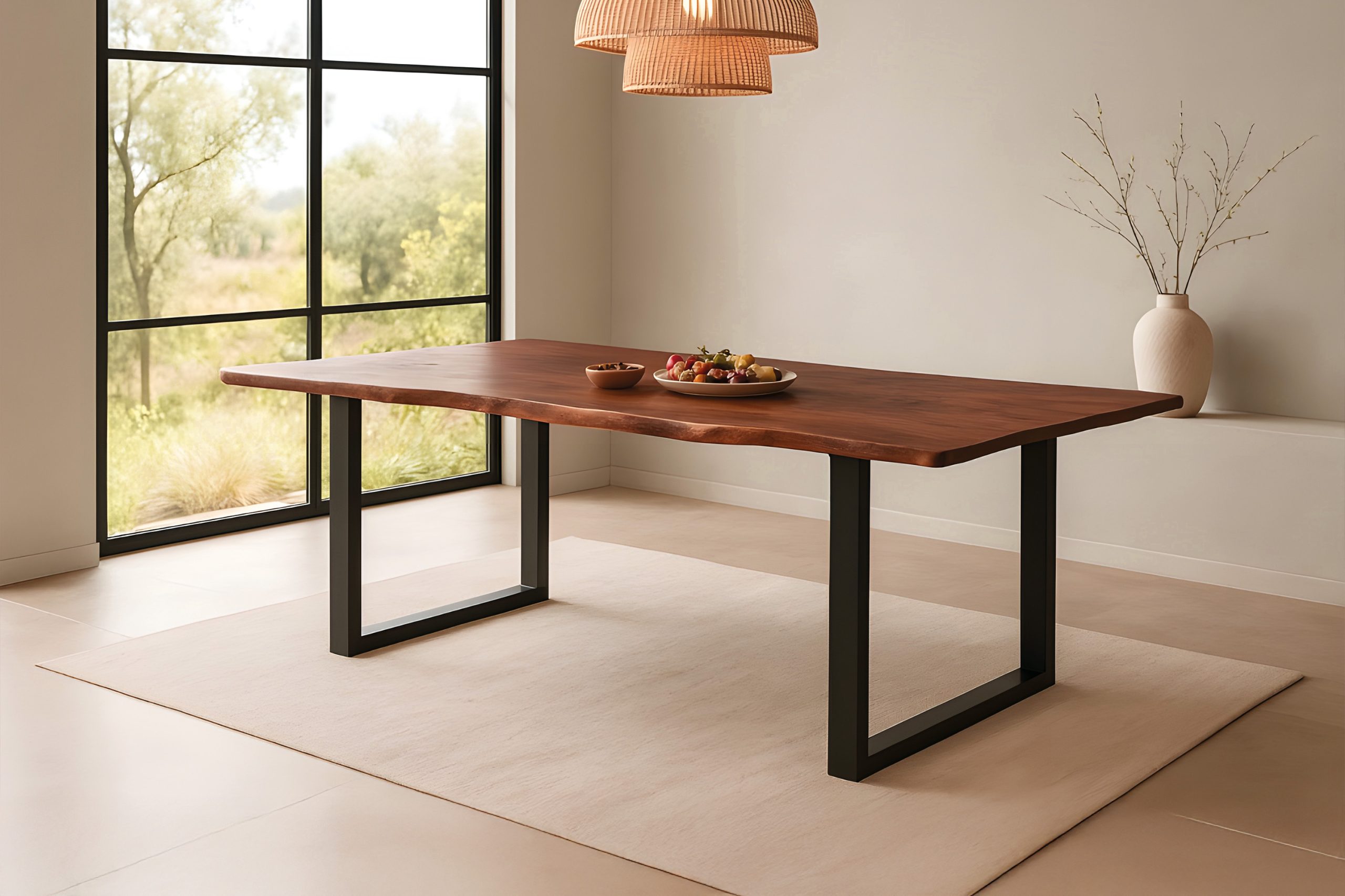 Das massive U-Gestell aus Eisen, schwarz lackiert, bildet einen modernen Kontrast zum natürlichen Holz. Es steht für Standfestigkeit, klare Linienführung und langlebige Funktionalität – ganz gleich, ob Sie den Holztisch täglich zum Essen, Arbeiten oder als Mittelpunkt im Familienleben nutzen.