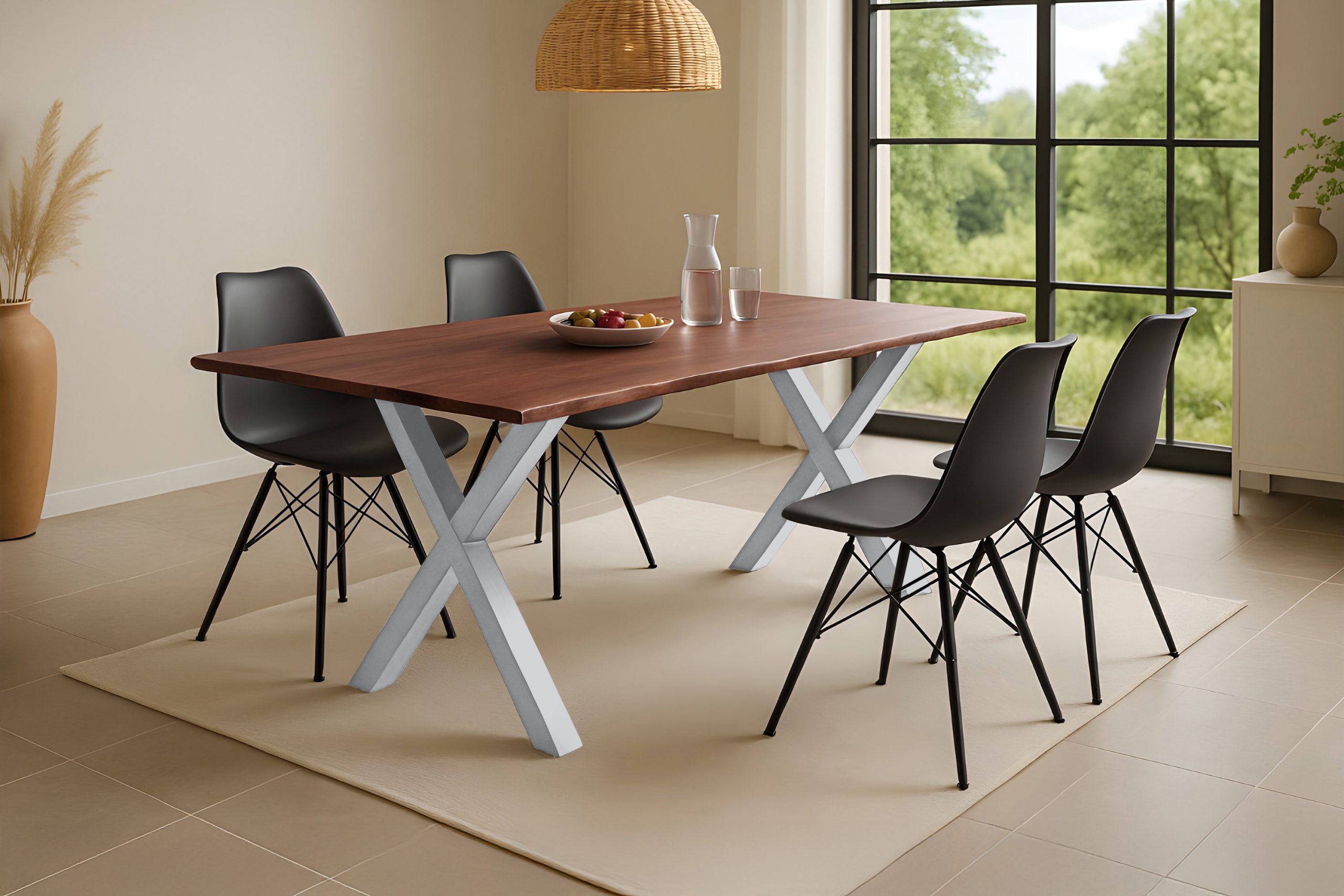 Das massive X-Gestell aus Eisen, silber lackiert, bildet einen modernen Kontrast zum natürlichen Holz. Es steht für Standfestigkeit, klare Linienführung und langlebige Funktionalität – ganz gleich, ob Sie den Holztisch täglich zum Essen, Arbeiten oder als Mittelpunkt im Familienleben nutzen.