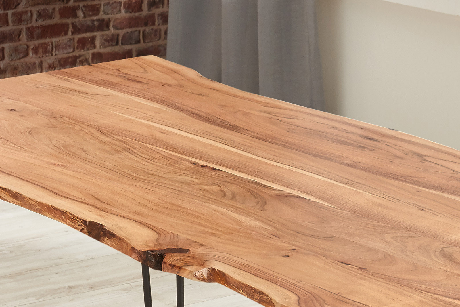 Trendiger Esszimmertisch Hannah mit schwarzem Hairpin-Gestell aus Roheisen, 140 x 80 cm, Akazienholz naturfarben, echte Baumkante, Tischplatte 26 mm