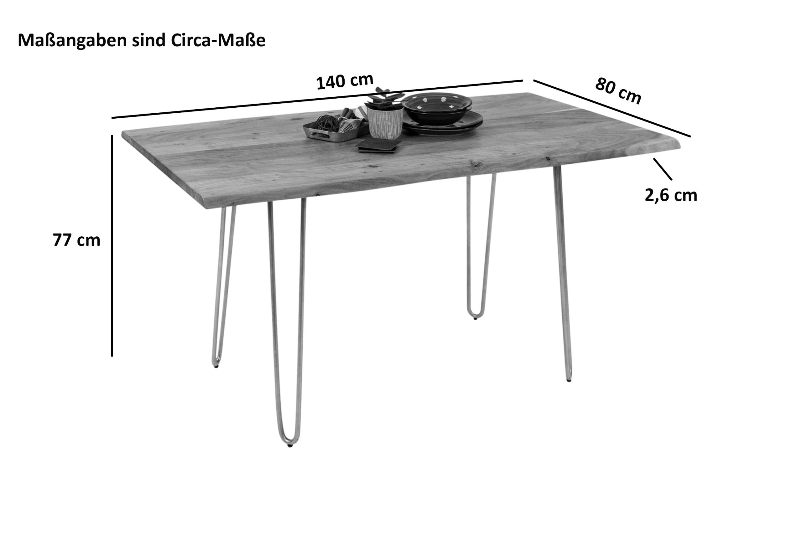 Trendiger Esszimmertisch Hannah mit silbernem Hairpin-Gestell aus Roheisen, 140 x 80 cm, Akazienholz naturfarben, echte Baumkante, Tischplatte 26 mm