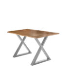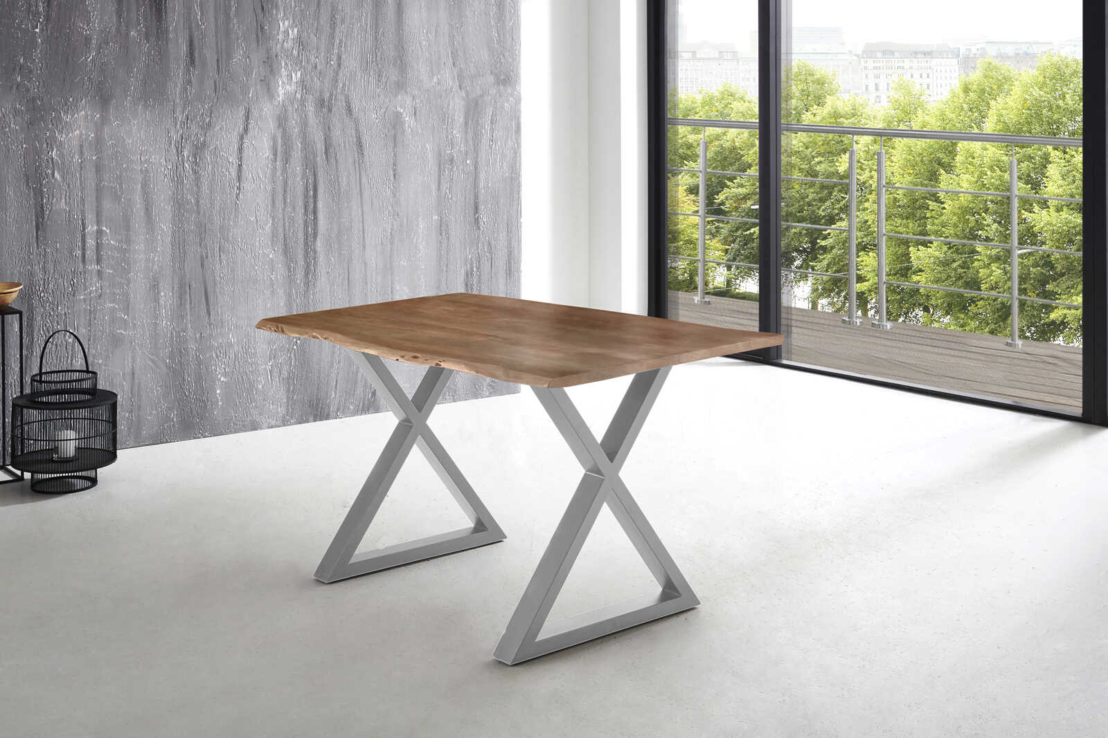 Baumkantentisch Lubin, Esszimmertisch 140 x 80 cm, Massivholz Akazie / Naturfarben, Gestell Silber