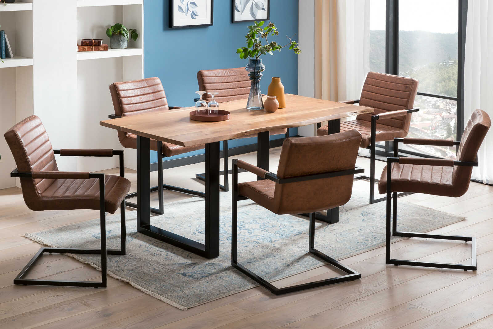 Die Tischkanten wurden aus dem Baumstamm herausgeschnitten und sind exakt so beibehalten, wie der Baum einmal gewachsen ist. Die Beine aus Metall sind ein besonderes Highlight: Mit dem eleganten U-Gestell setzen Sie gezielte Akzente in jedem Ambiente – gemütlich und rustikal, modern und puristisch oder im Industrial Design.