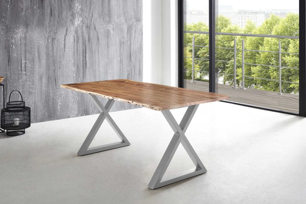 Dieser Baumkantentisch mit einzigartiger Holzmaserung eignet sich ideal als Esstisch. Die massive Tischplatte auf dem X-förmigen Metallgestell macht Ihren Essbereich zu einem echten Hingucker!