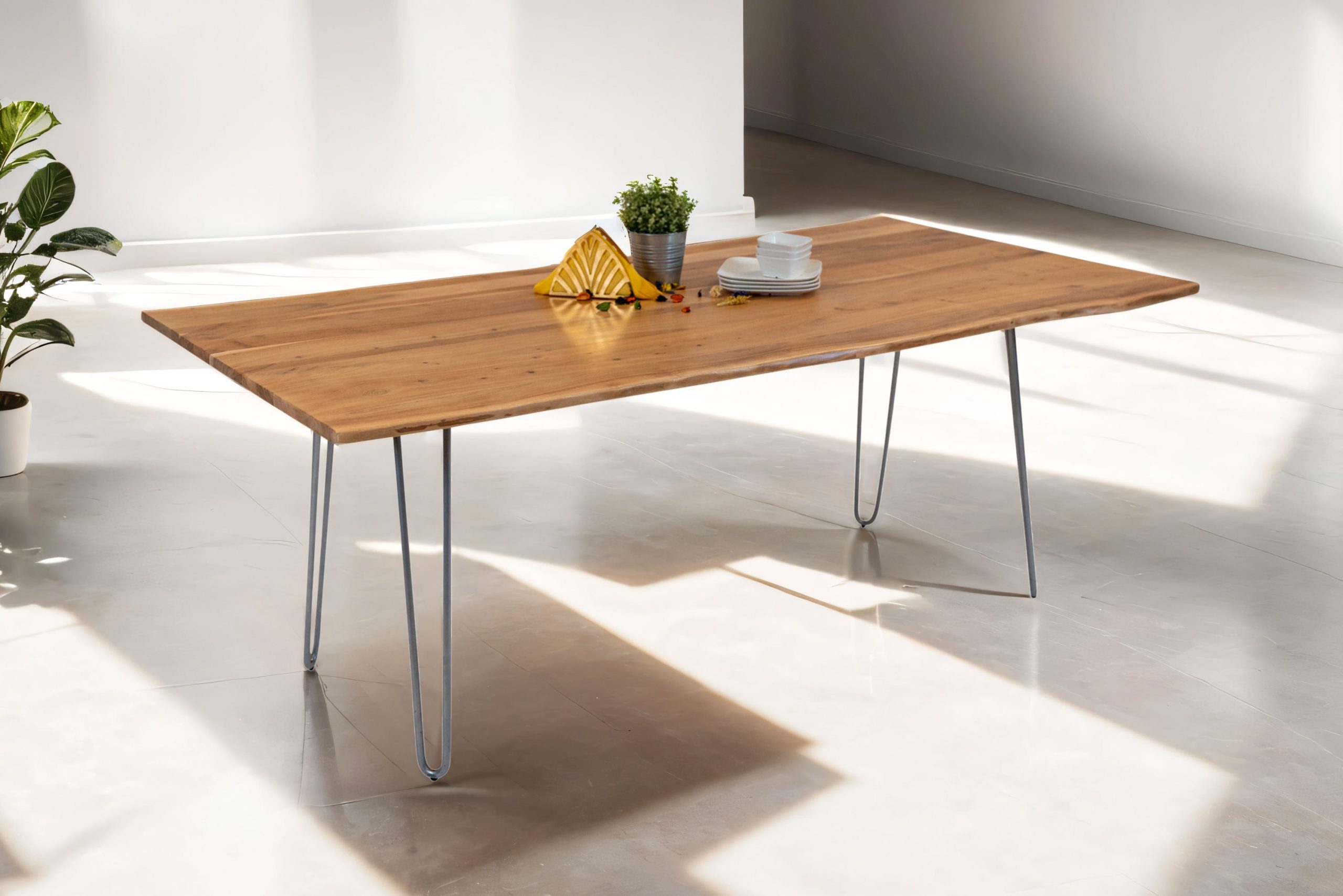 Trendiger Esszimmertisch Hannah mit silbernem Hairpin-Gestell aus Roheisen, 200 x 100 cm, Akazienholz naturfarben, echte Baumkante, Tischplatte 26 mm