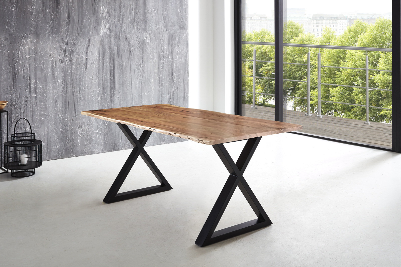Dieser Baumkantentisch mit einzigartiger Holzmaserung eignet sich ideal als Esstisch. Die massive Tischplatte auf dem X-förmigen Metallgestell macht Ihren Essbereich zu einem echten Hingucker!