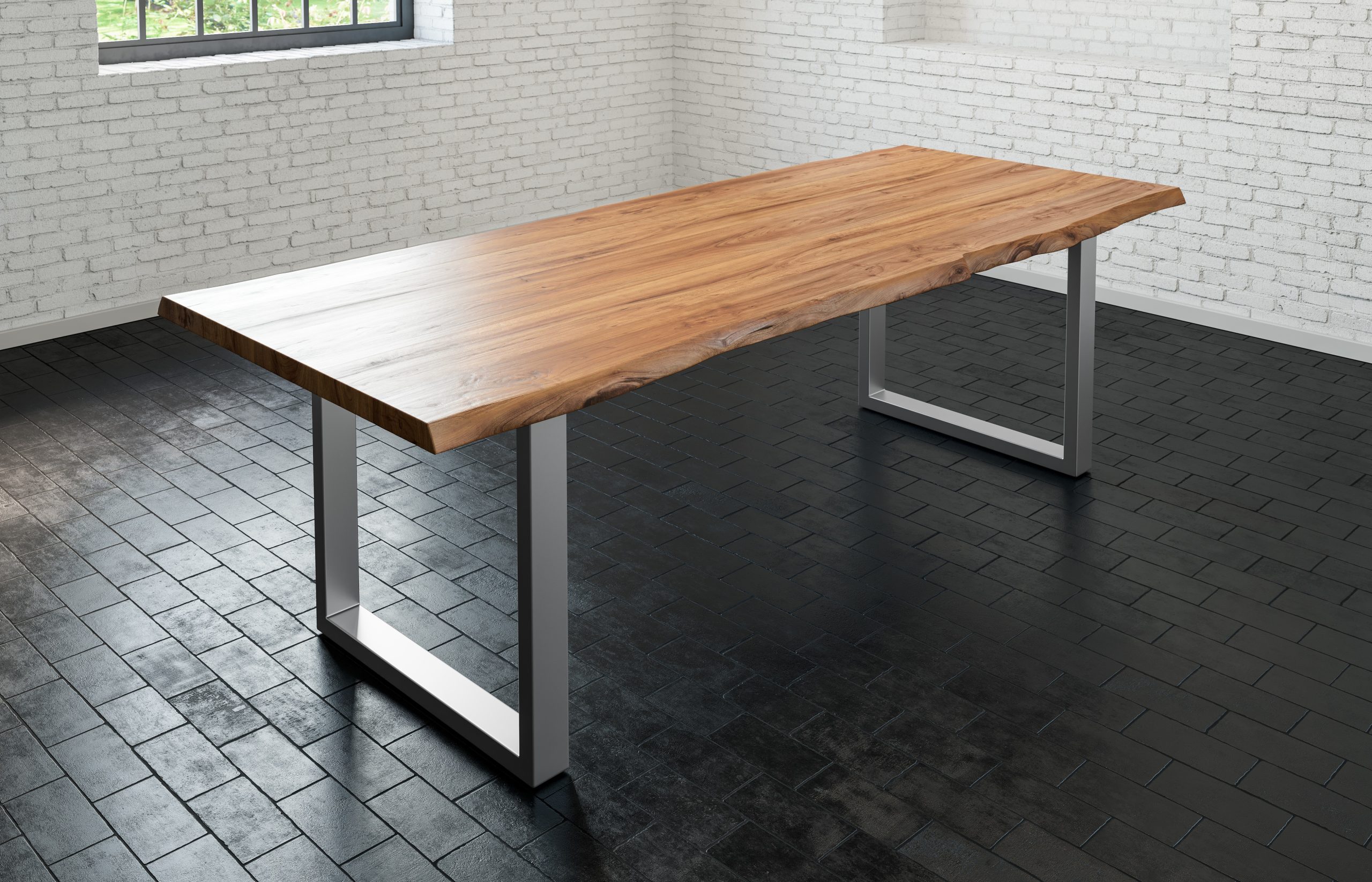 Baumkantentisch Liam | 220 x 100 cm | Akazienholz massiv + naturfarben | 35 mm Tischplatte mit echter Baumkante | U-Gestell Silber