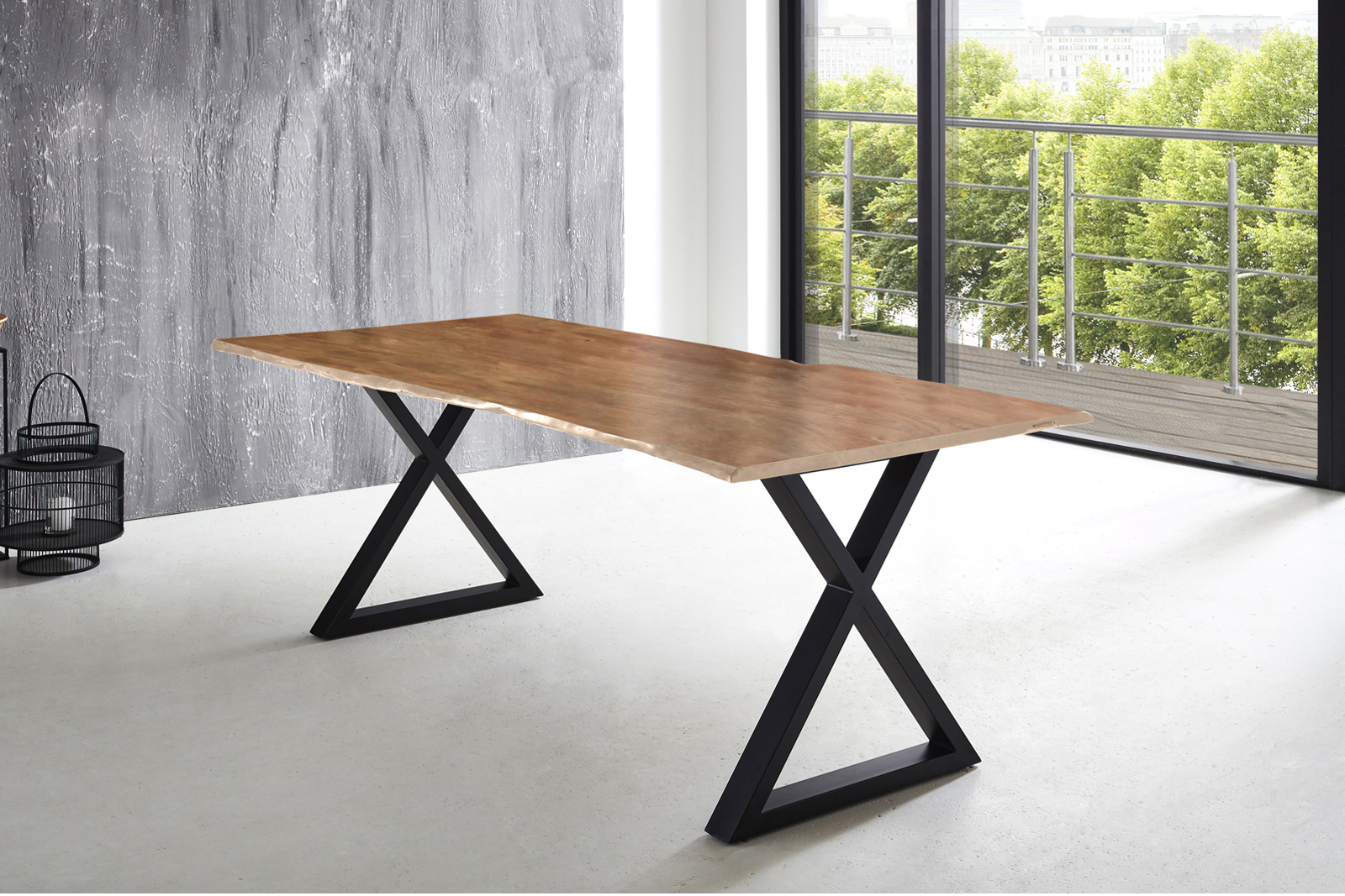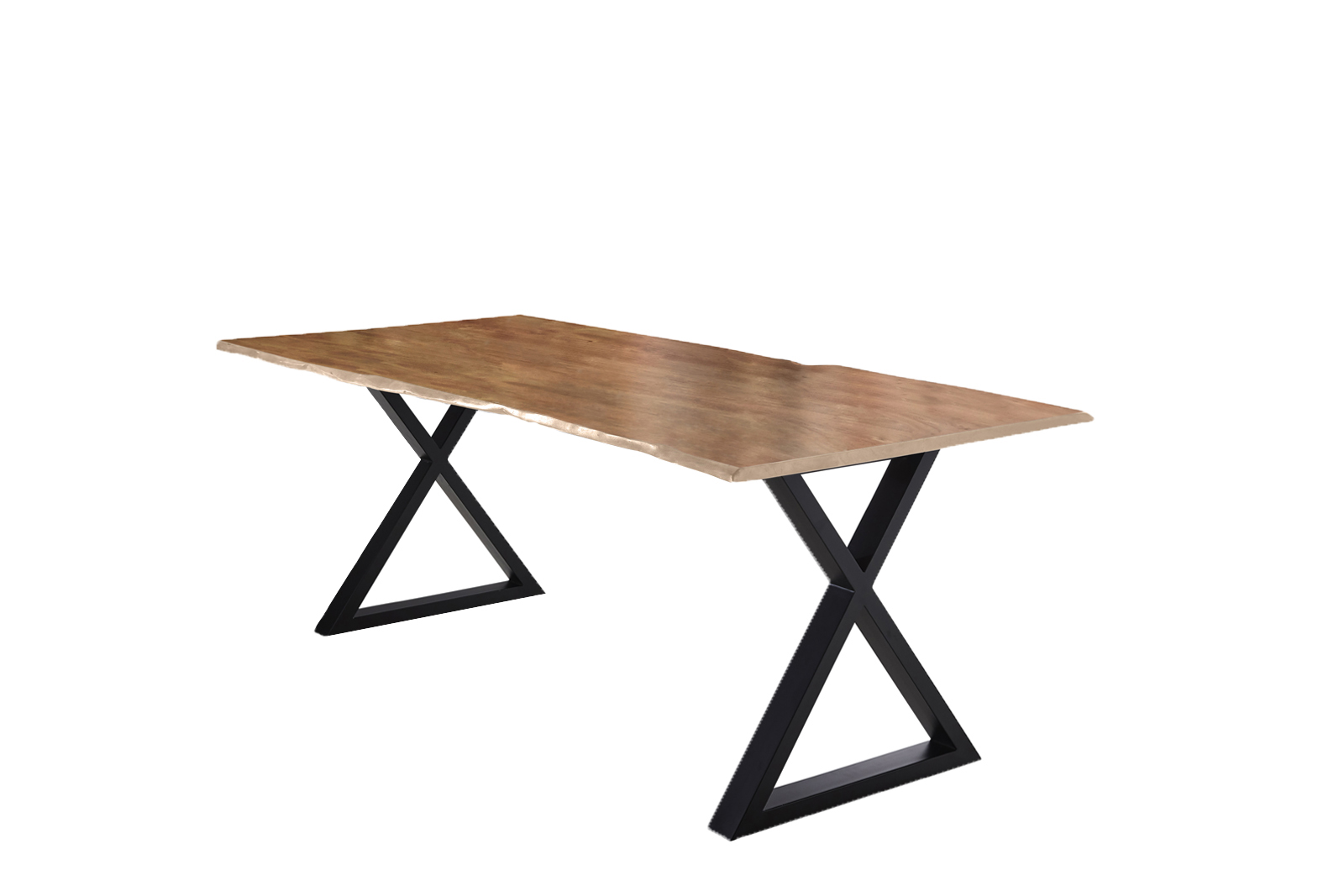Dieser Baumkantentisch mit einzigartiger Holzmaserung eignet sich ideal als Esstisch. Die massive Tischplatte auf dem X-förmigen Metallgestell macht Ihren Essbereich zu einem echten Hingucker!