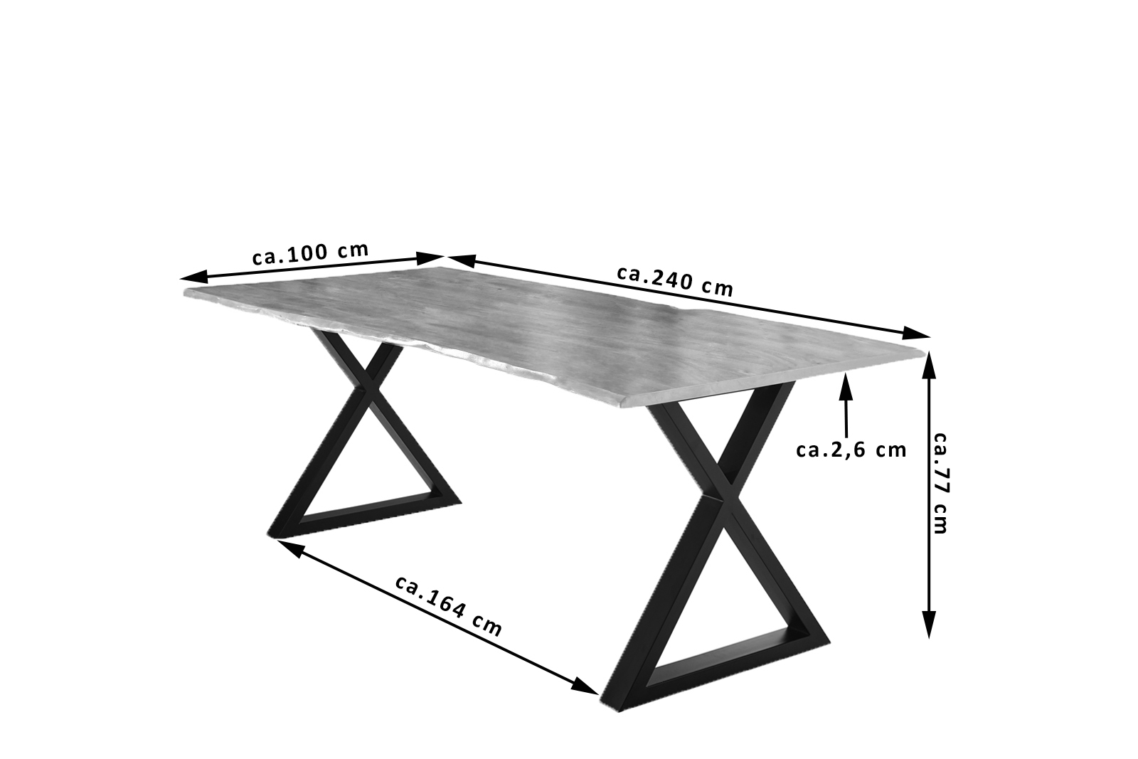 - Länge: 240 cm | Breite: ca. 100 cm | Gesamthöhe: ca. 77 cm | Tischplattenstärke: ca. 2,6 cm