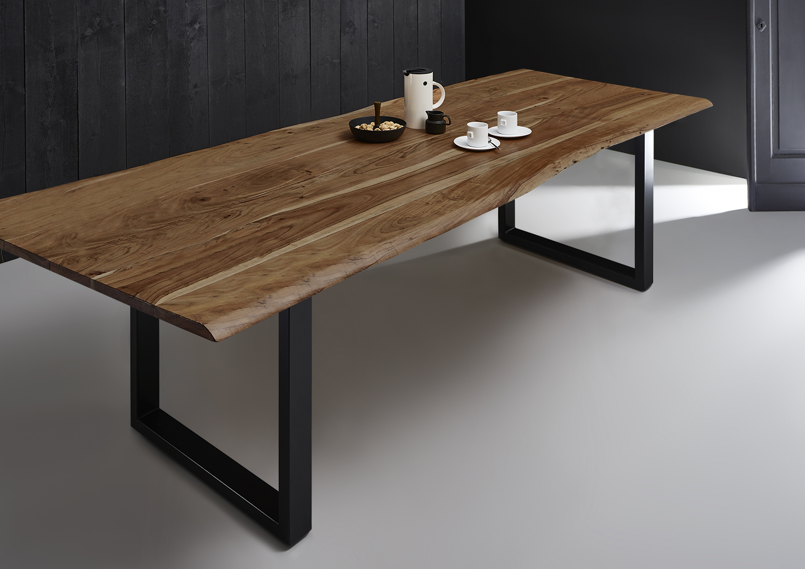 Baumkantentisch Milo, Esszimmertisch 280 x 100 cm, Massivholz Akazie, naturfarben / U-Gestell schwarz