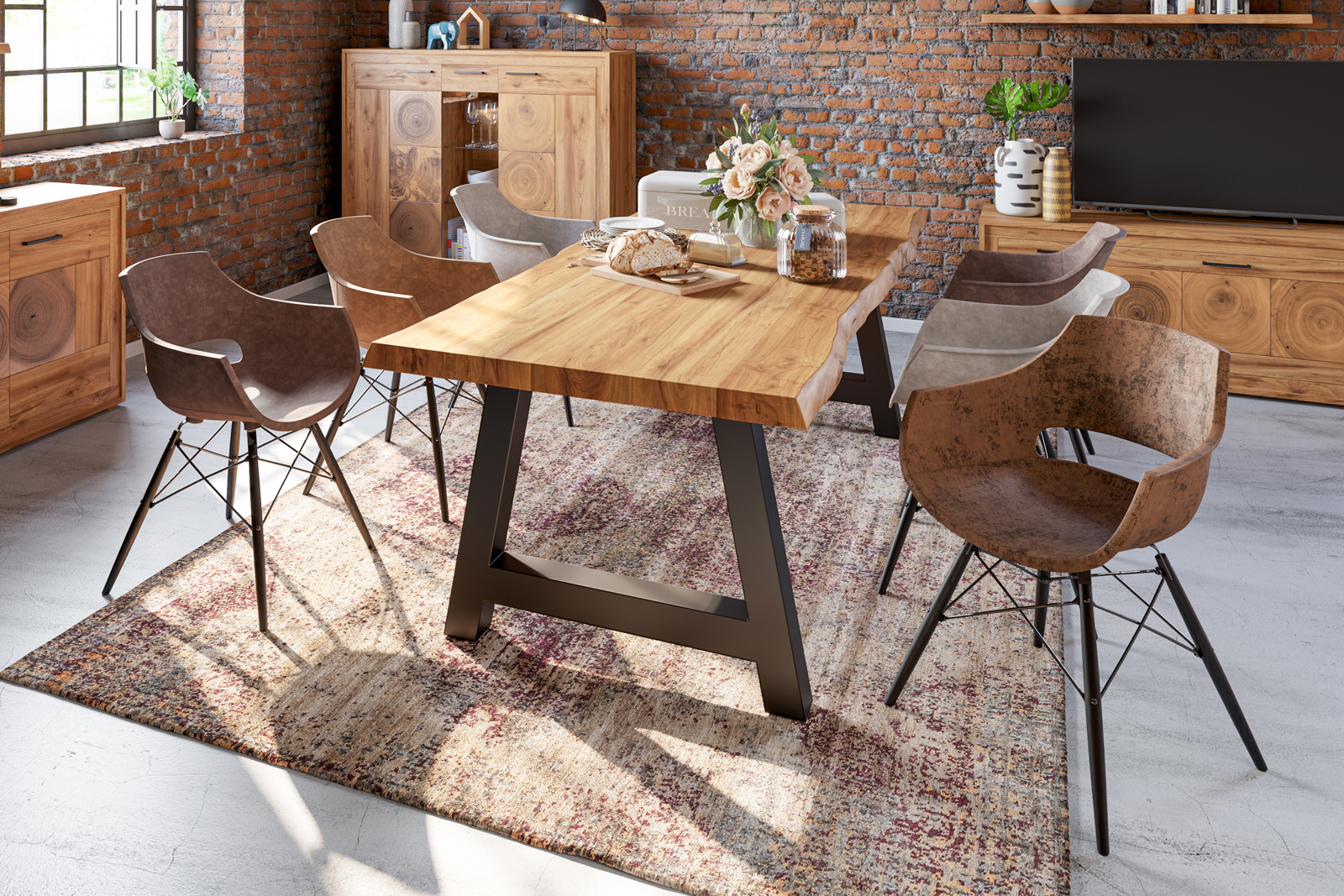 Unser trendiger Esstisch “Alicante“ überzeugt durch eine perfekt gelungene Kombination aus Natürlichkeit und stylischer Moderne. Besonderes Highlight des Esszimmertisches sind die Tischkanten, die den natürlichen Formen eines Baumes entsprechen und direkt aus dem Baumstamm geschnitten wurden. Das A-Gestell sorgt für einen gelungenen Kontrast, welcher dem Massivholz-Tisch einen Hauch von industriellem Look verleiht.