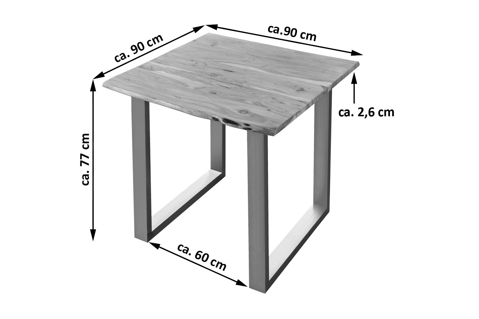 Baumkantentisch Lubin, Esszimmertisch 80 x 80 cm, Massivholz Akazie / Naturfarben, Gestell Silber