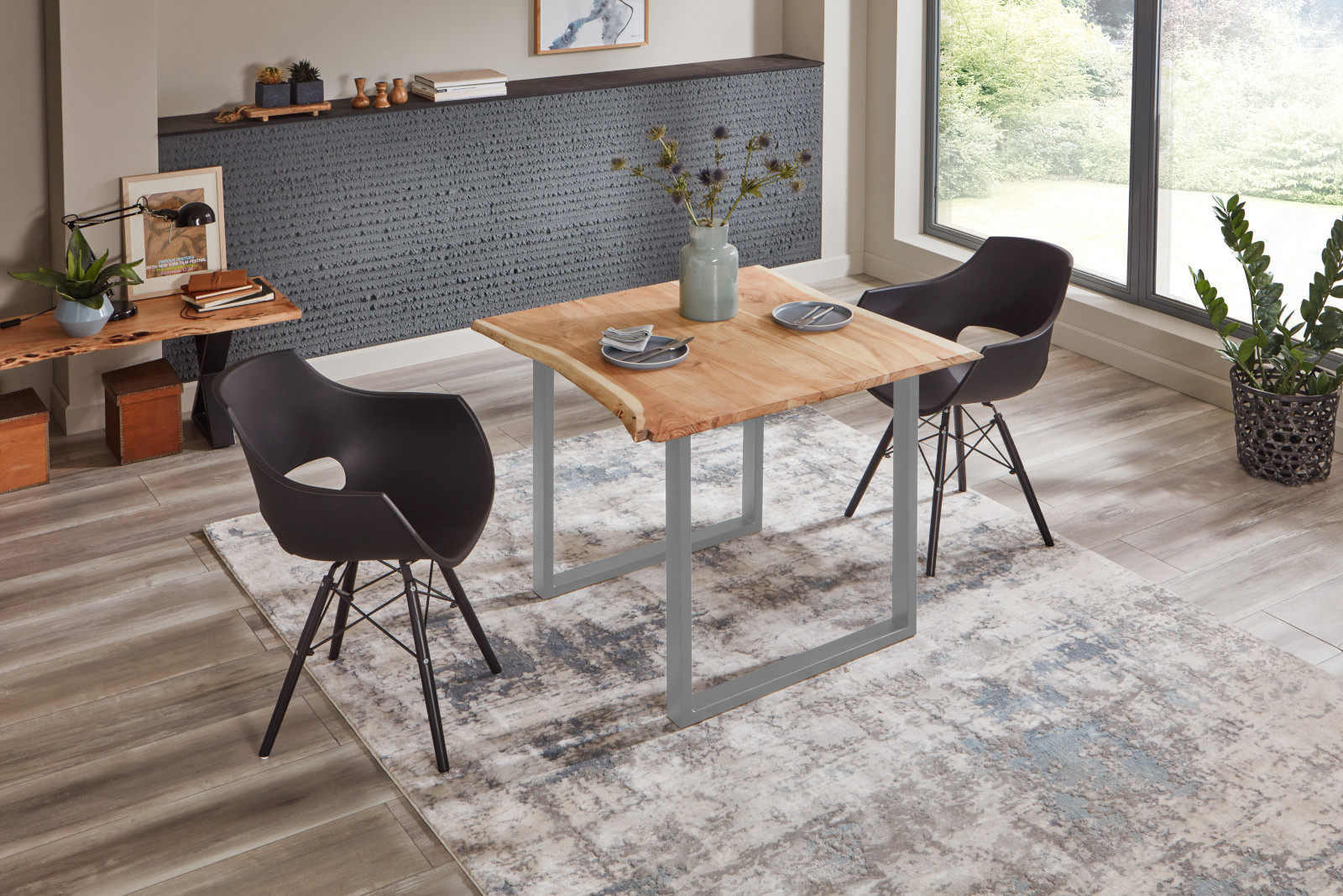 Baumkantentisch Billy, Esszimmertisch 90 x 90 cm, Massivholz Akazie, Naturfarben / Silber