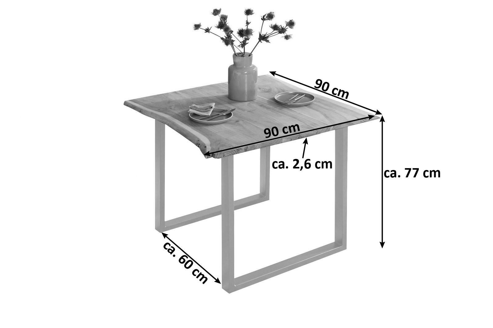 • Länge: 90 cm | Breite: ca. 90 cm | Gesamthöhe: ca. 77 cm | Tischplatte: ca. 2,6 cm | Gestellstärke: ca. 6 x 3 cm
