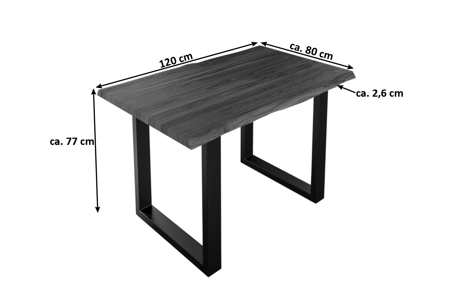 - Länge: 120 cm | Breite: ca. 80 cm | Gesamthöhe: ca. 77 cm | Tischplattenstärke: ca. 2,6 cm