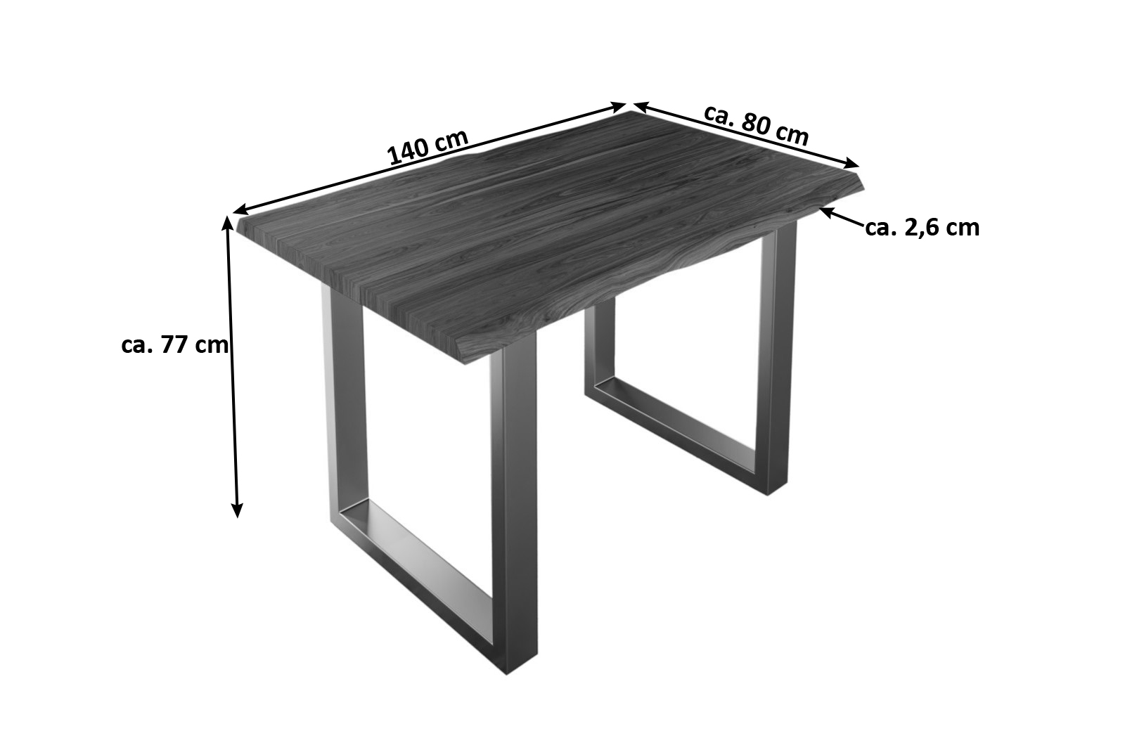 • Länge: 140 cm | Breite: ca. 80 cm | Gesamthöhe: ca. 77 cm | Tischplattenstärke: ca. 2,6 cm
