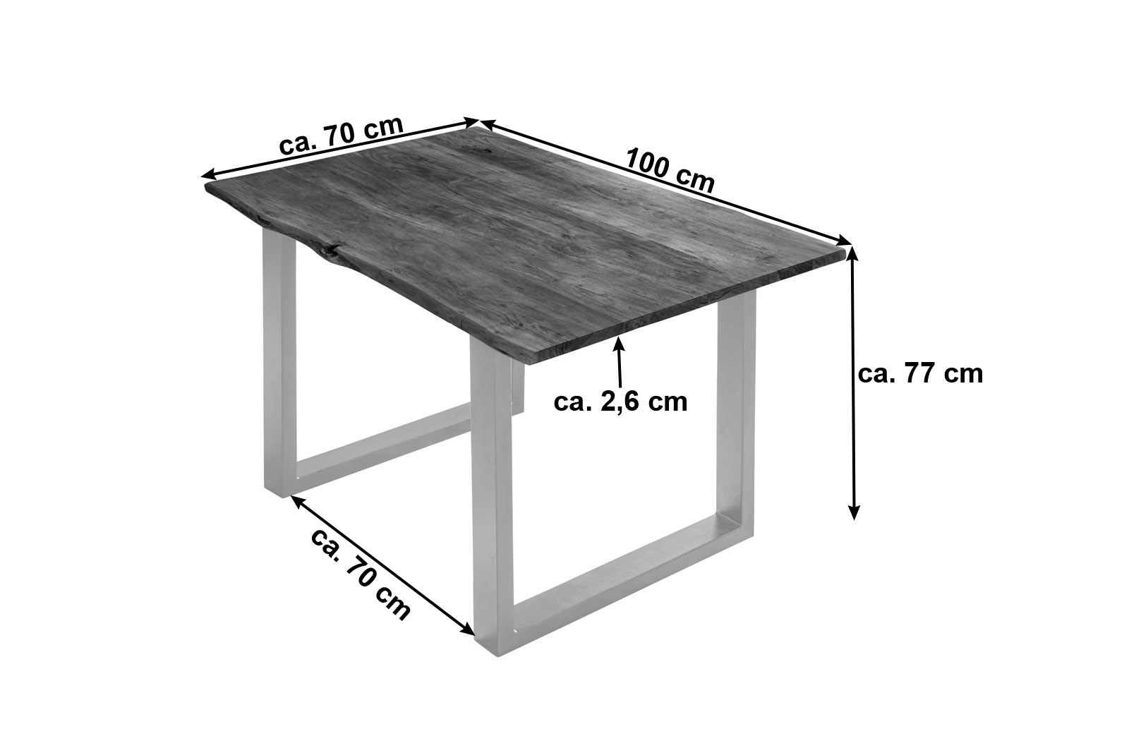 • Länge: 100 cm | Breite: ca. 70 cm | Gesamthöhe: ca. 77 cm | Tischplatte: ca. 2,6 cm | Gestellstärke: ca. 6 x 3 cm