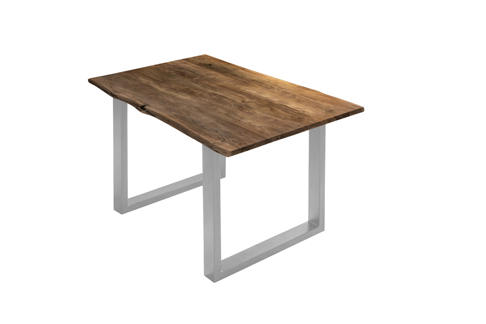 Baumkantentisch Billy, Esszimmertisch 100 x 70 cm, Massivholz Akazie, Nussbaumfarben / Silber
