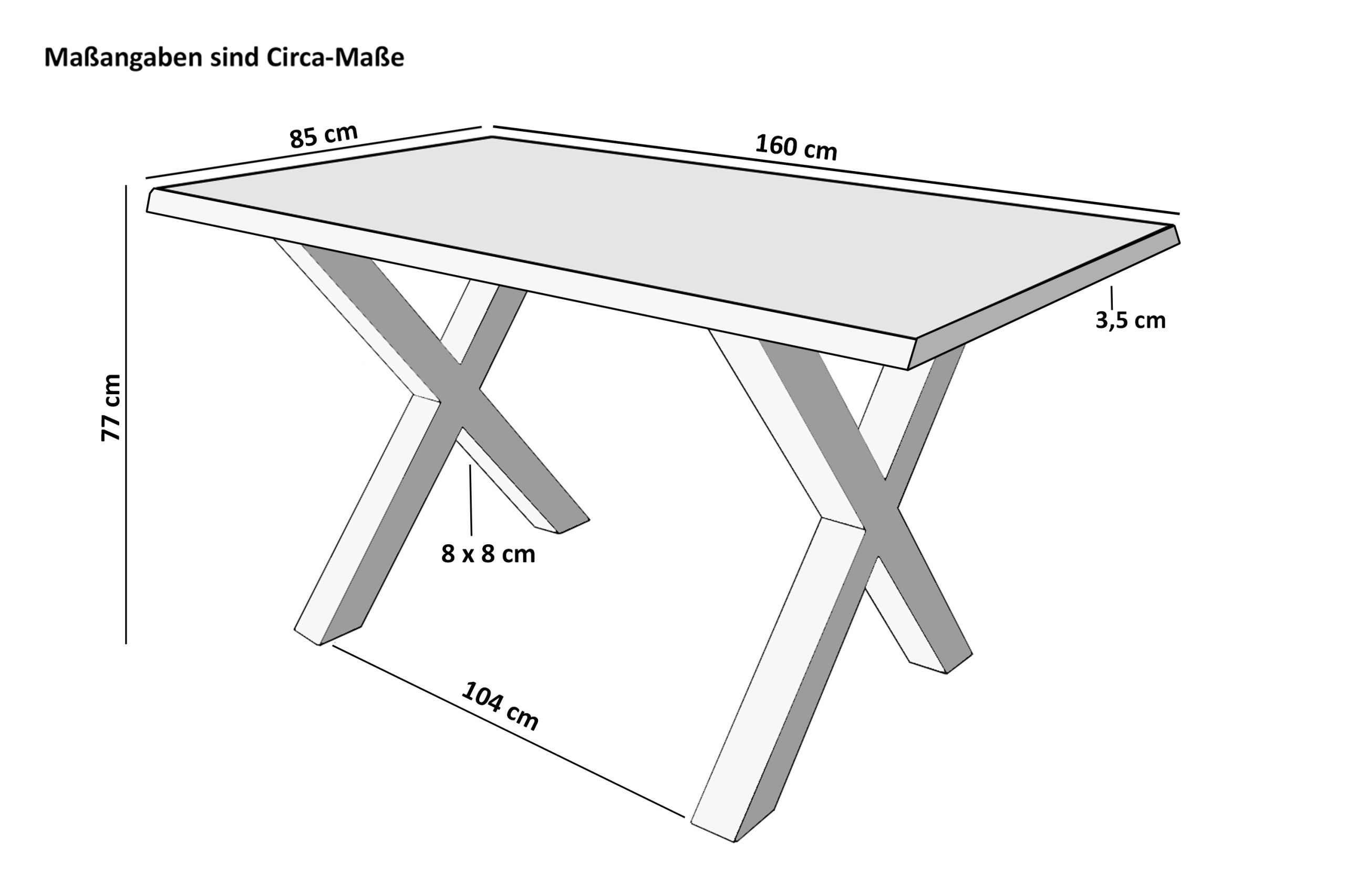 - Länge: 160 cm | Breite: ca. 85 cm | Gesamthöhe: ca. 77 cm | Tischplatte: ca. 2,6 cm