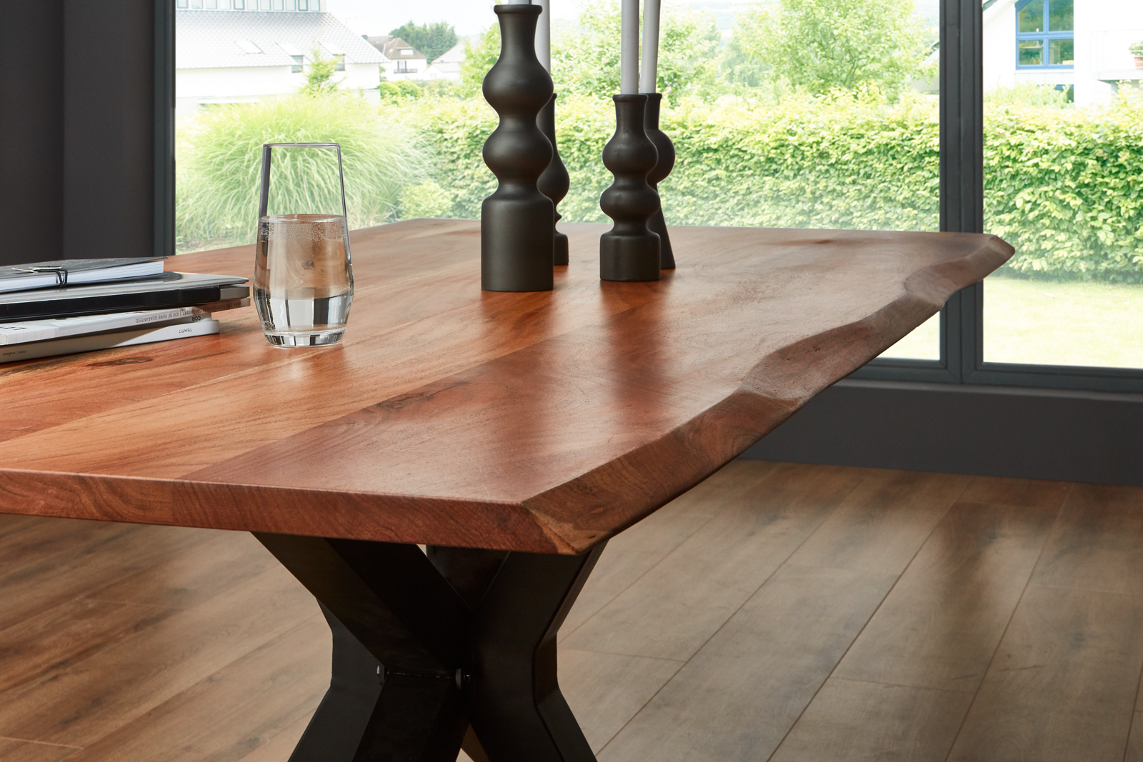 Esstisch Baumkante massiv Akazie nussbaum 180 x 90 Spider-Gestell schwarz SPYRO