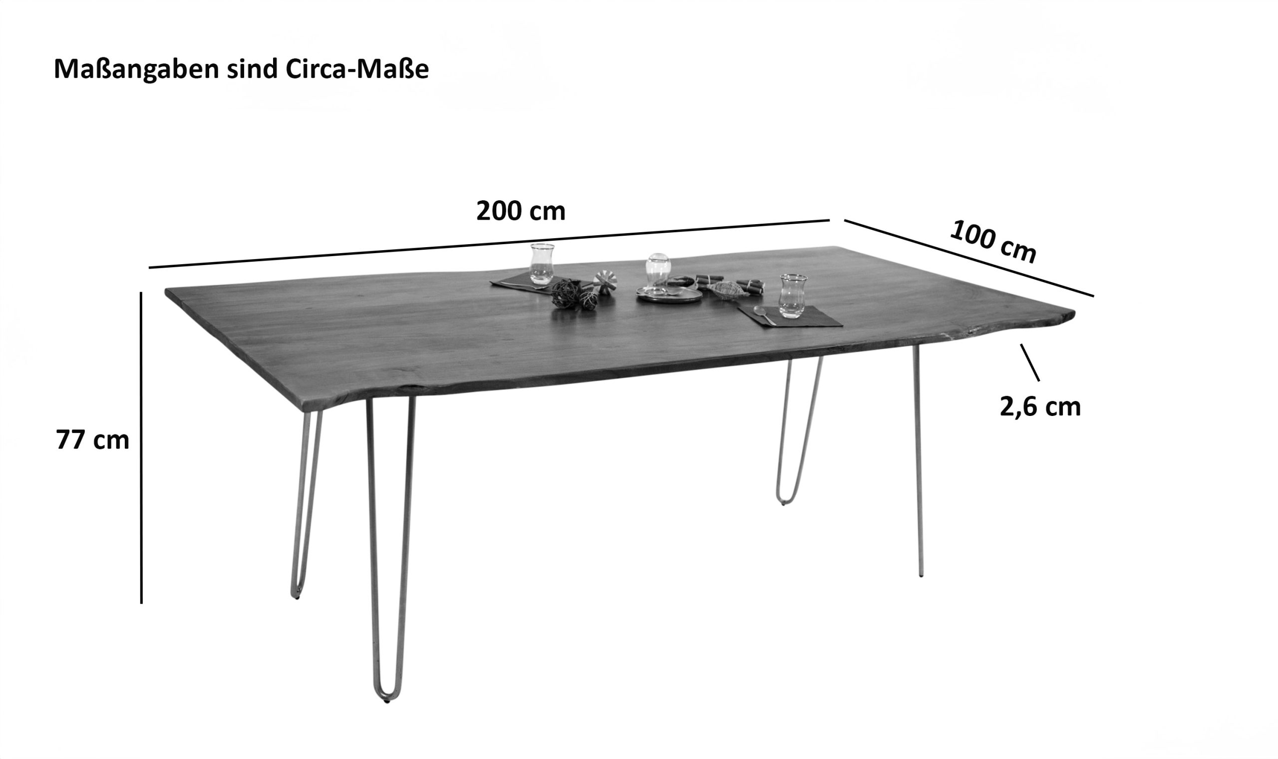 • Hochwertiger und trendiger Esstisch mit 26 mm dicker Holzplatte mit echter Baumkante.