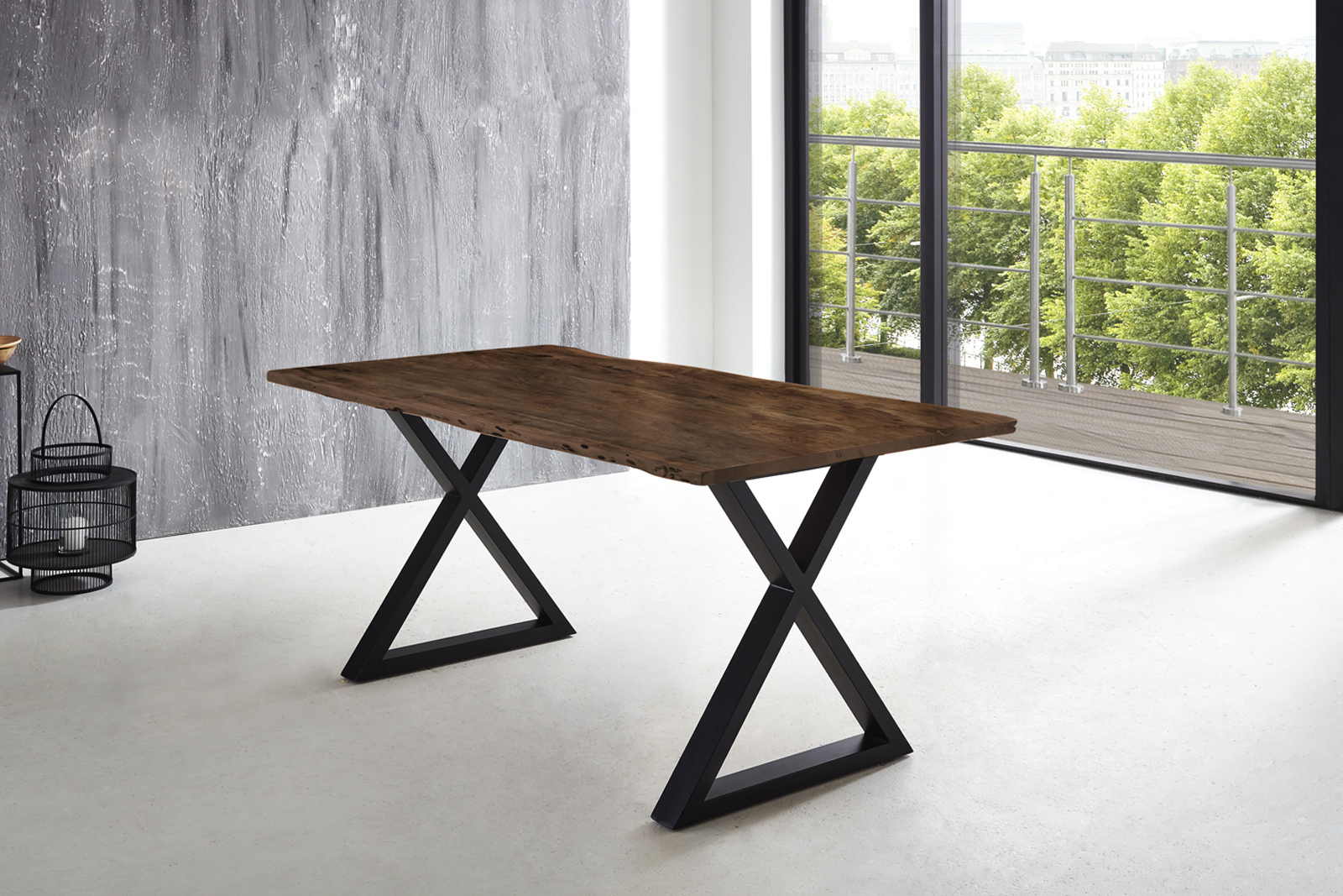 Esstisch Baumkante massiv Akazie nussbaum 200 x 100 X-Gestell schwarz LUBIN