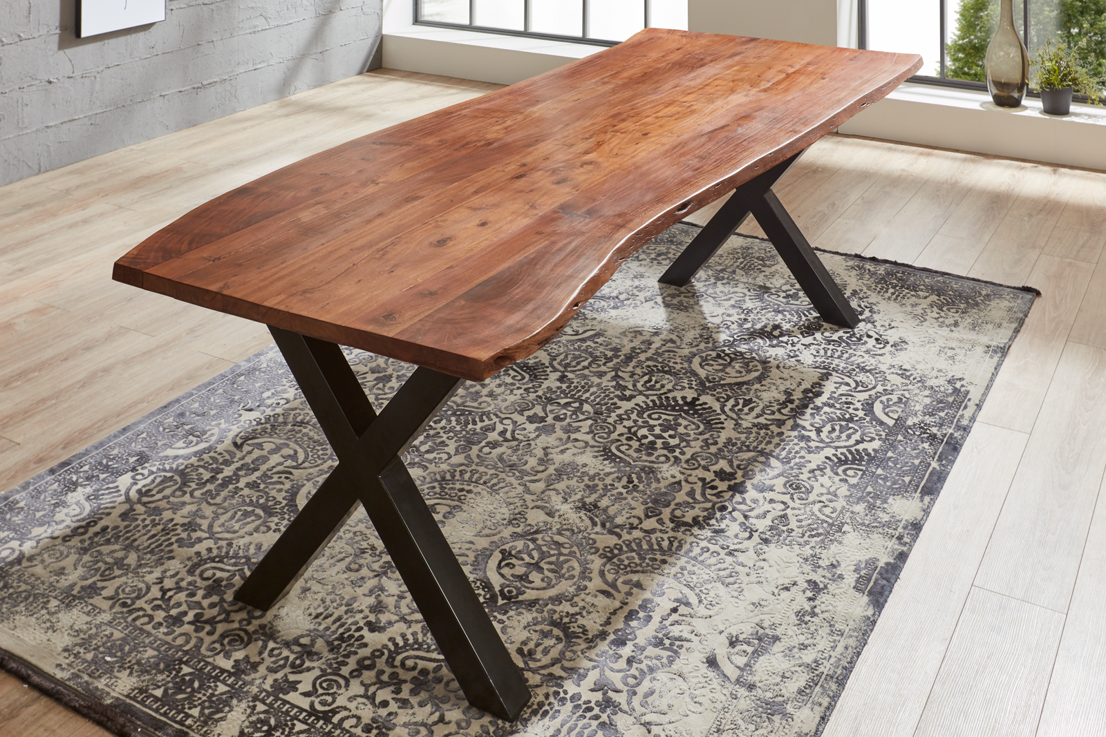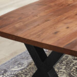 Unser trendiger Esstisch “Xanten“ überzeugt durch eine perfekt gelungene Kombination aus Natürlichkeit und stylischer Moderne. Besonderes Highlight des Esszimmertisches sind die Tischkanten, die den natürlichen Formen eines Baumes entsprechen und direkt aus dem Baumstamm geschnitten wurden. Das X-förmige Gestell sorgt für einen gelungenen Kontrast, welcher dem Massivholz-Tisch einen Hauch von industriellem Look verleiht.