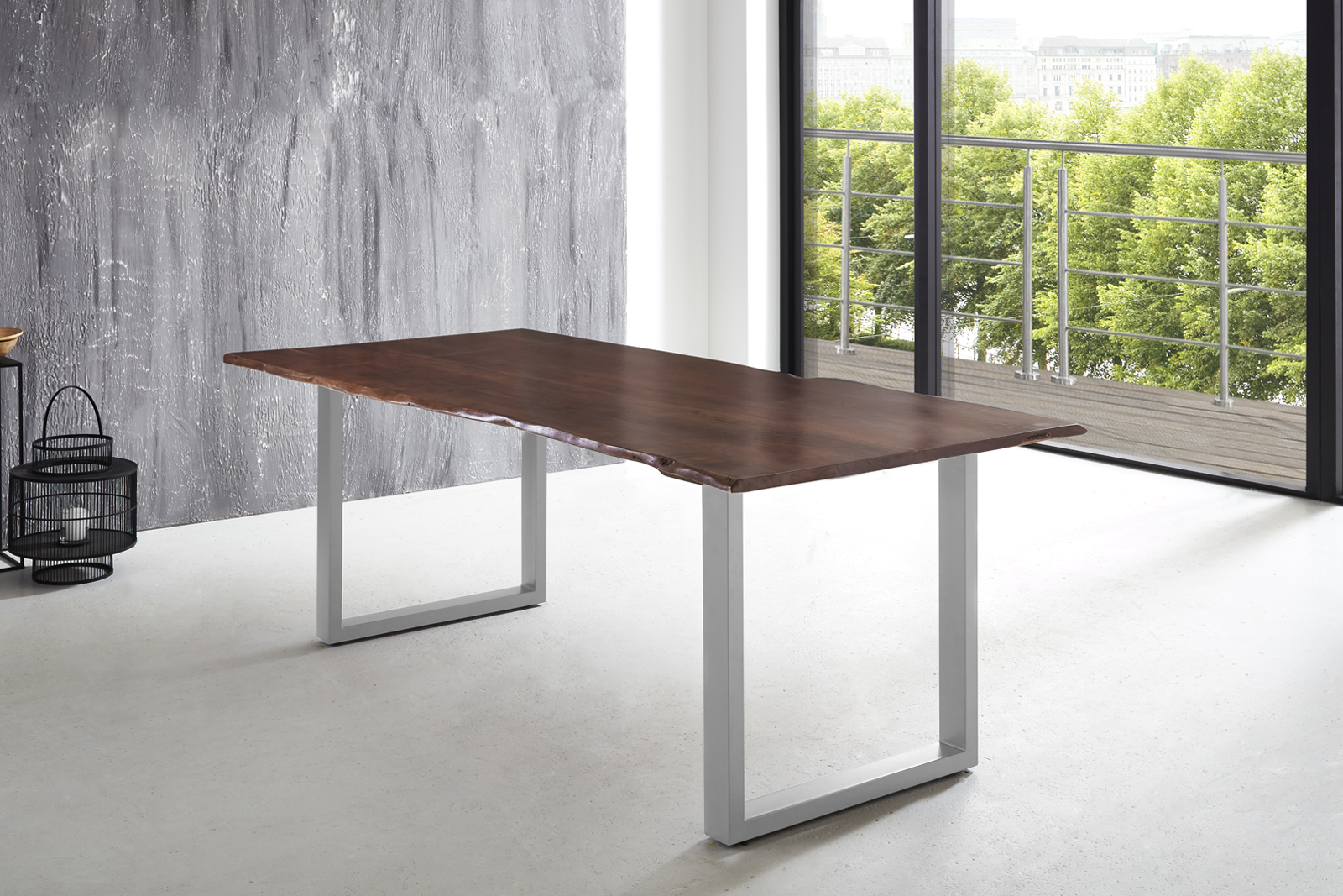 Baumkantentisch Lubin, Esszimmertisch 220 x 100 cm, Massivholz Akazie / Nussbaumfarben, Gestell Silber