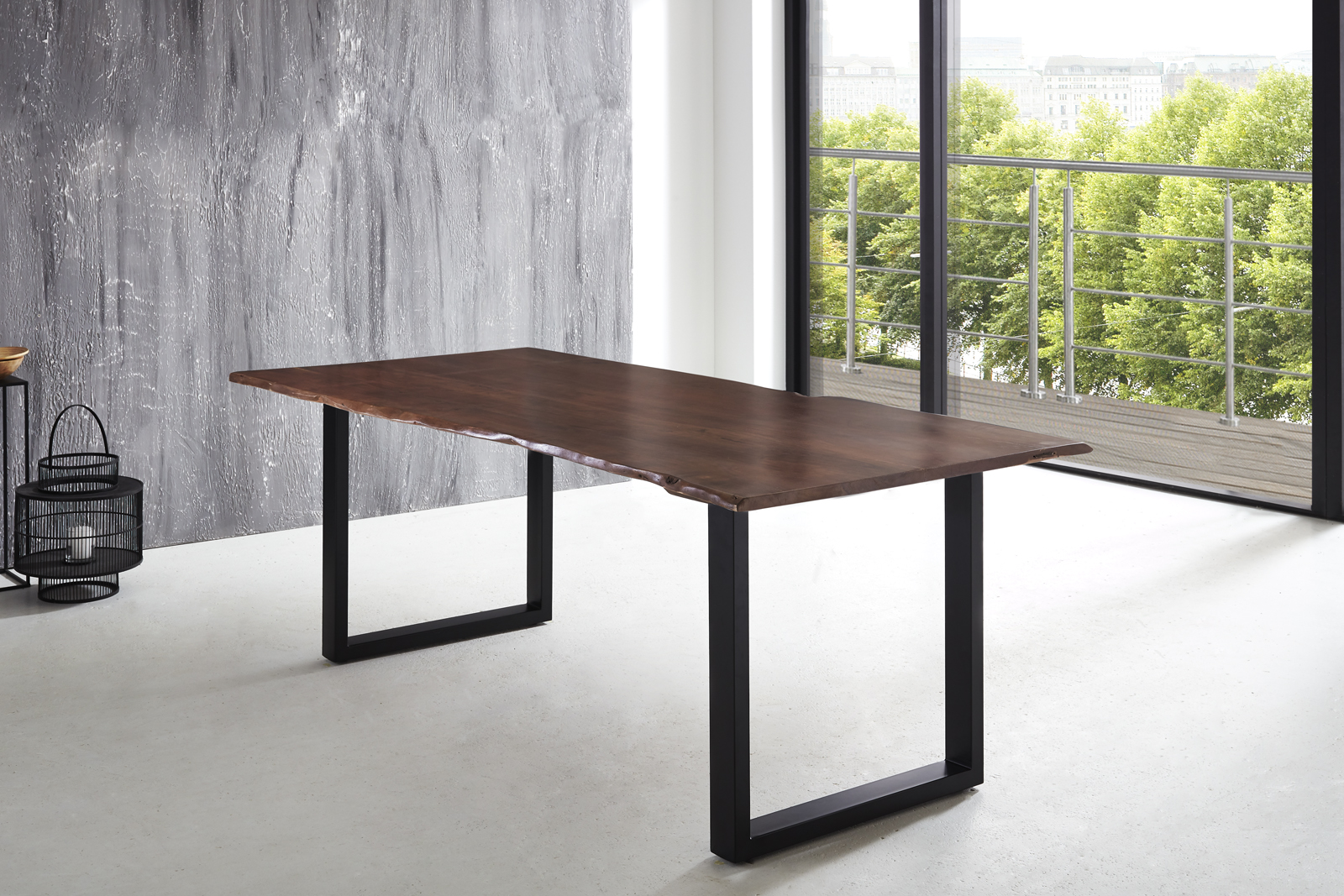 Baumkantentisch Lubin, Esszimmertisch 240 x 100 cm, Massivholz Akazie / Nussbaumfarben, Gestell Schwarz