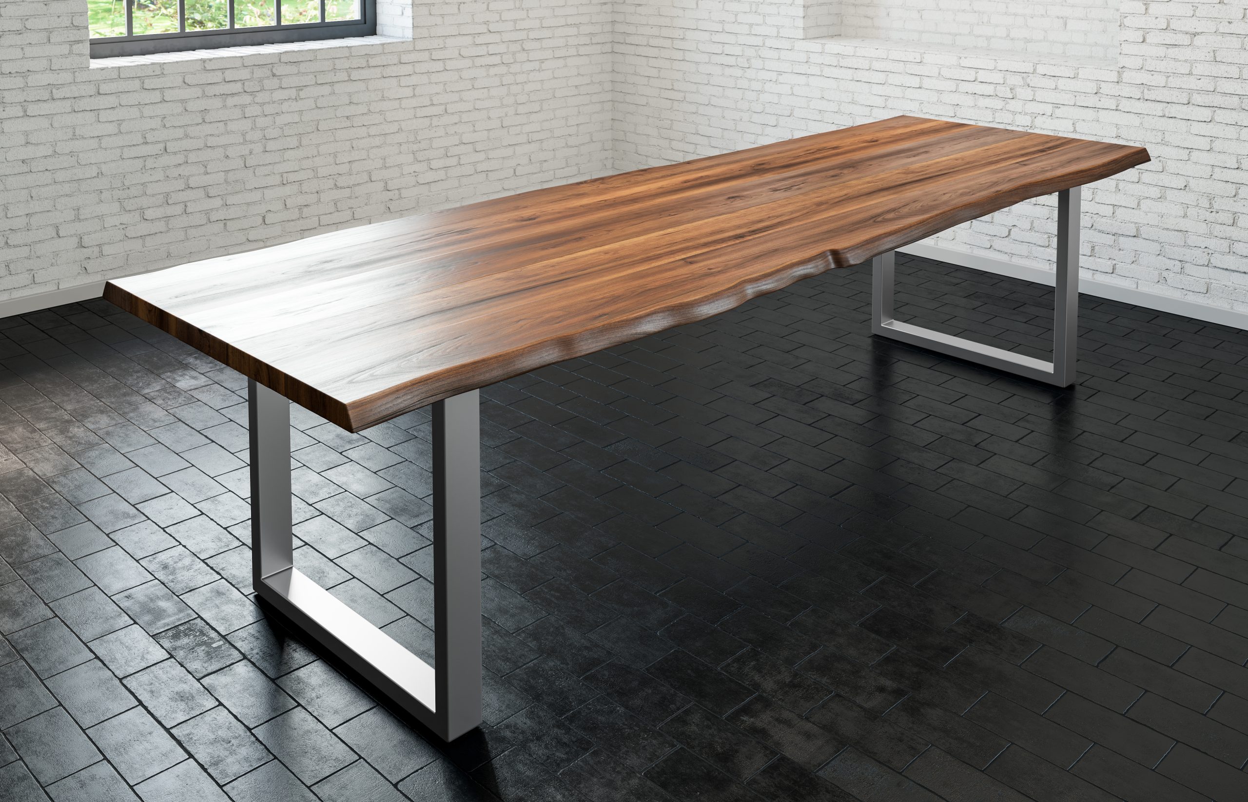 Baumkantentisch Liam | 300 x 100 cm | Akazienholz massiv + nussbaumfarben | 35 mm Tischplatte mit echter Baumkante | U-Gestell Silber
