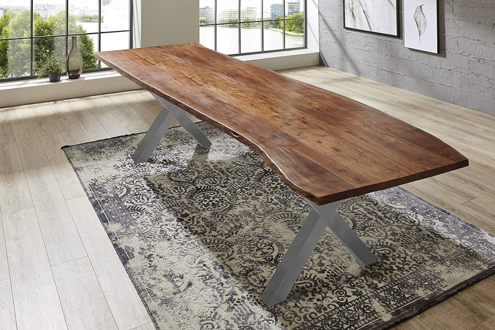 Baumkantentisch XAVER, Esszimmertisch 300 x 100 cm, Massivholz Akazie, nussbaumfarben / silber