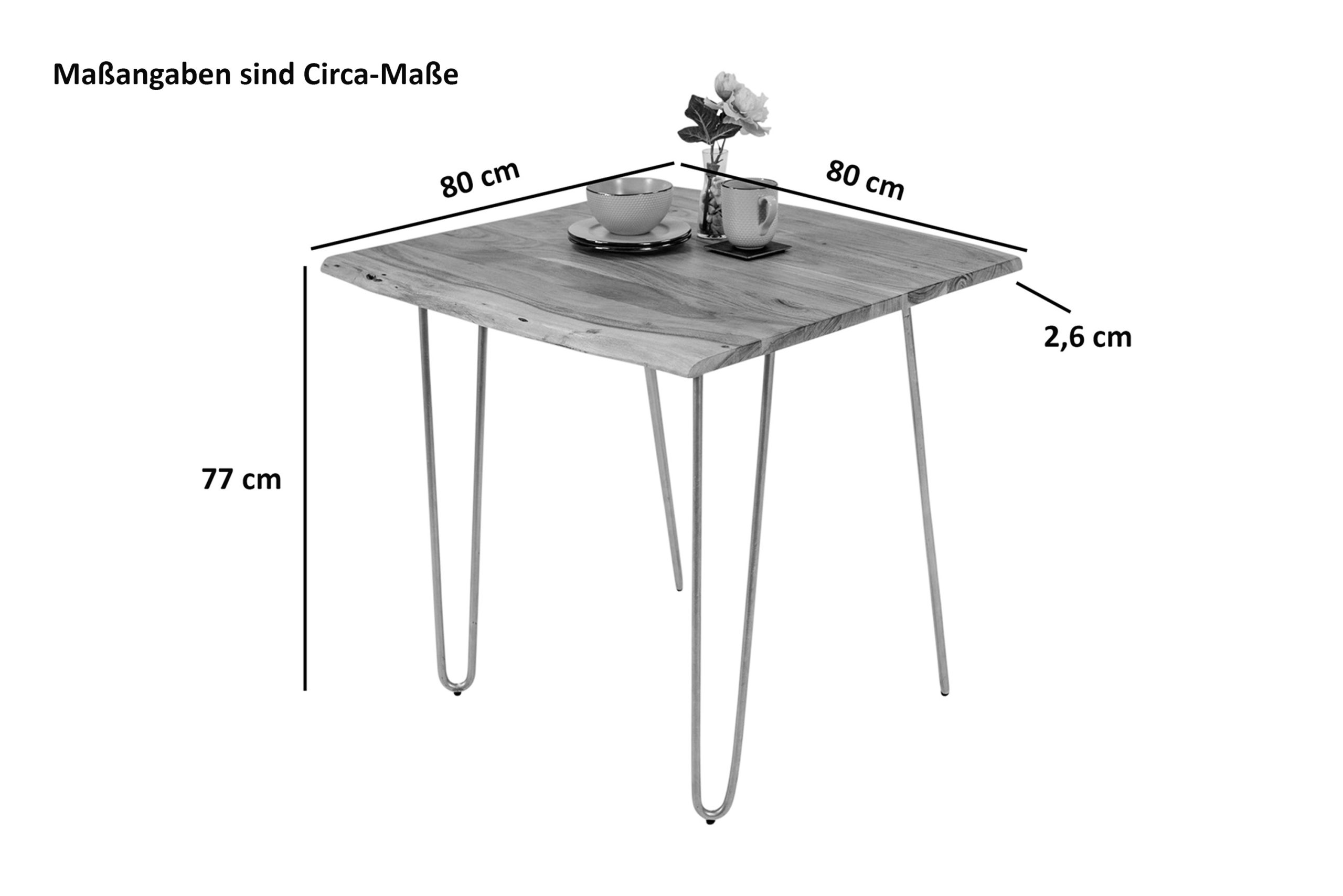 Trendiger Esszimmertisch Hannah mit silbernem Hairpin-Gestell aus Roheisen, 80 x 80 cm, Akazienholz nussbaumfarben, echte Baumkante, Tischplatte 26 mm