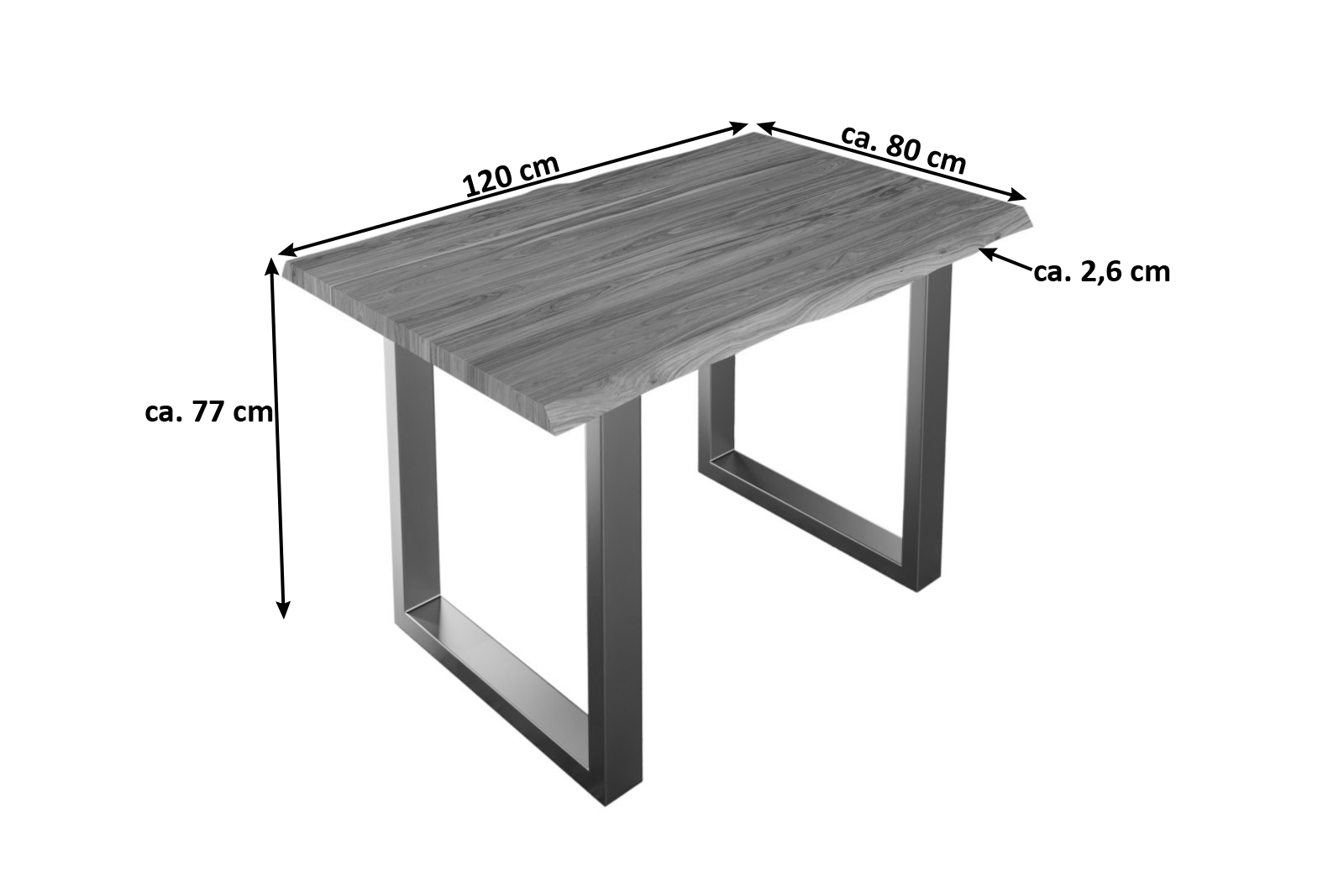 • Länge: 120 cm | Breite: ca. 80 cm | Gesamthöhe: ca. 77 cm | Tischplattenstärke: ca. 2,6 cm