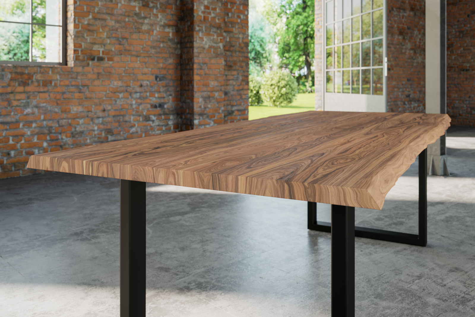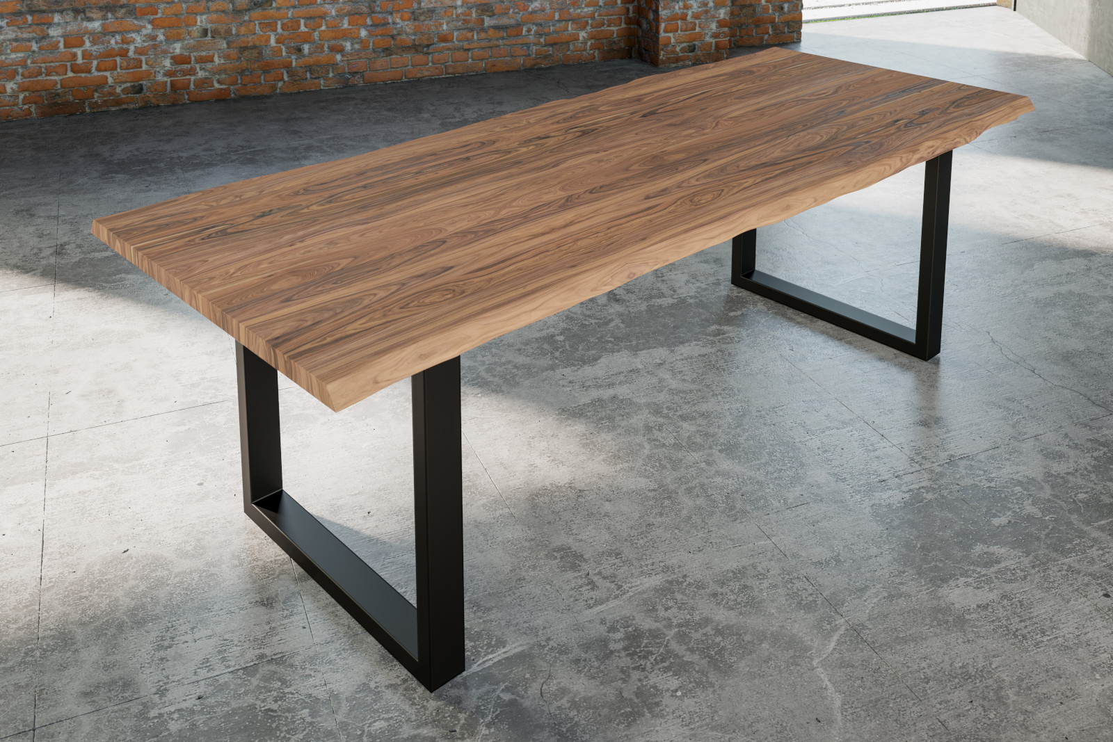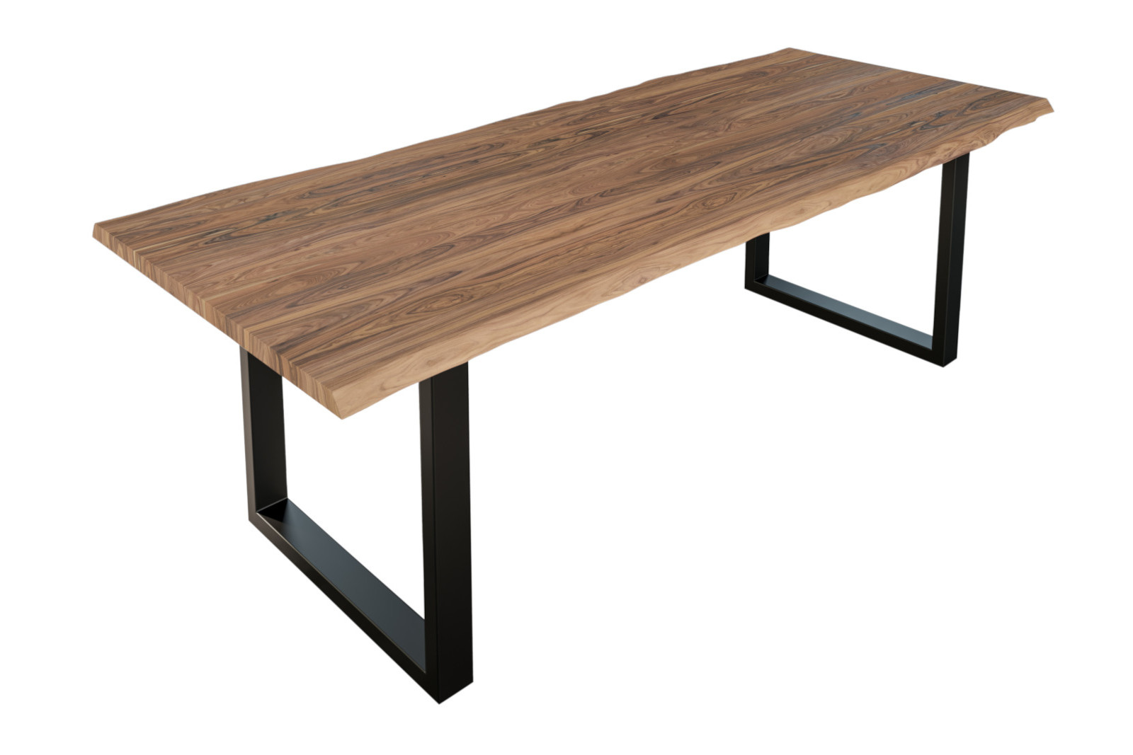 Massiver Esstisch Lauren 240 x 100 cm, massives Akazienholz Natur in stone, naturbelassene Baumkante, schwarzes U-Gestell