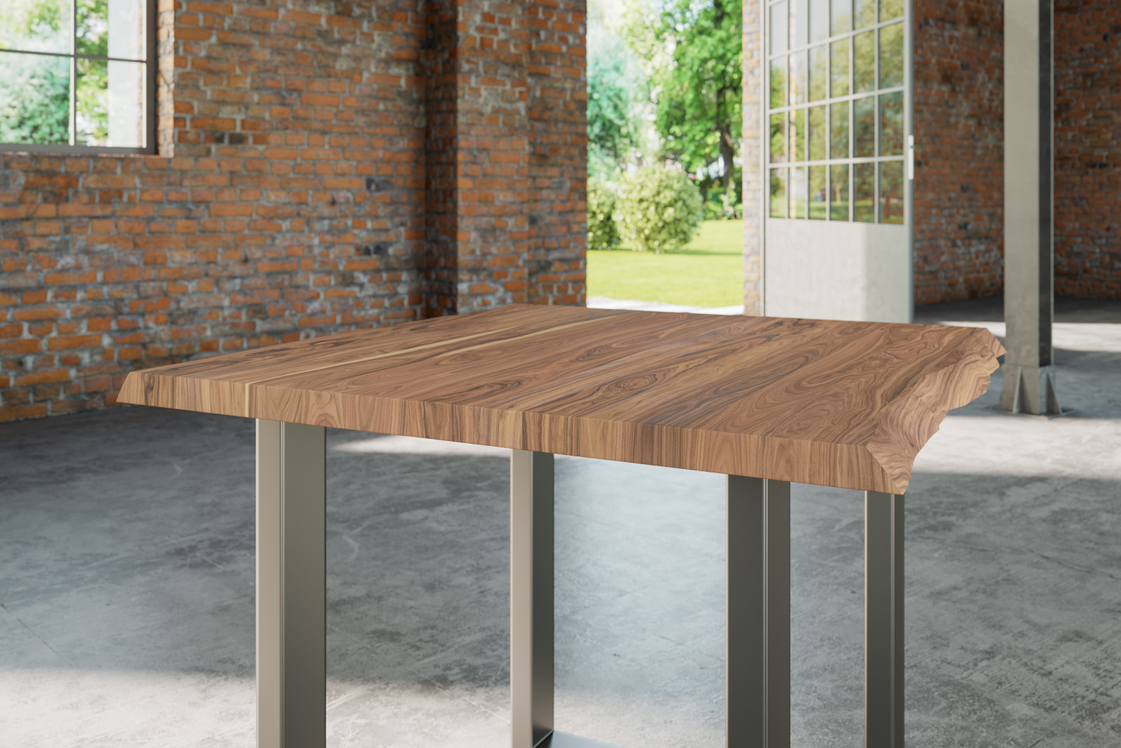 Massiver Esstisch Lauren 90 x 90 cm, massives Akazienholz Natur in stone, naturbelassene Baumkante, schwarzes U-Gestell
