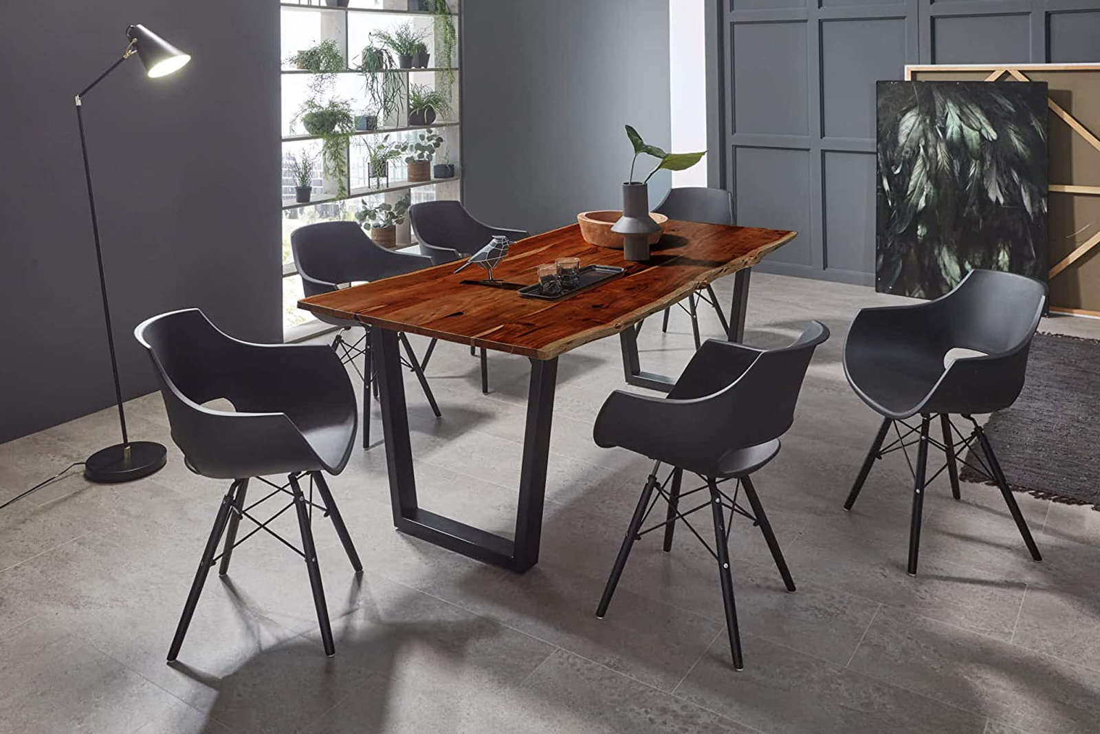 Baumkantentisch Quila, Esszimmertisch 160 x 85 cm, Massivholz Akazie, Nussbaumfarben / schwarz