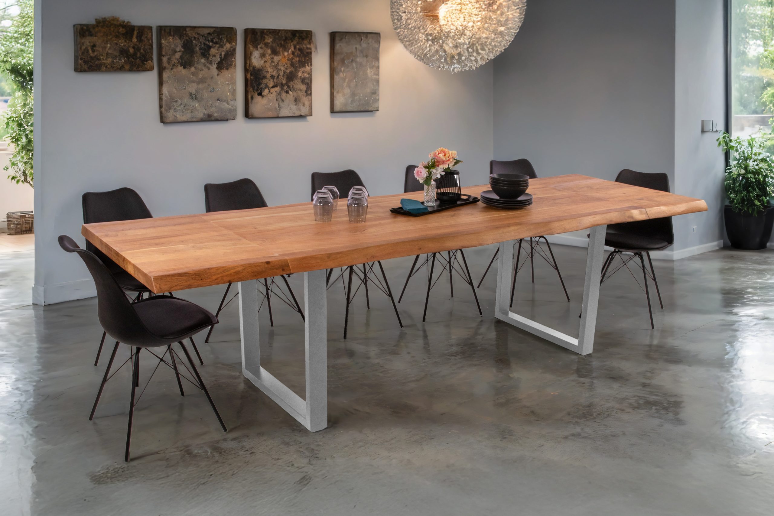 Esszimmertisch Cali mit Ansteckplatten | echte Baumkante | Akazienholz naturfarben + massiv | U-Gestell Metall silber | 200–300 x 100 cm