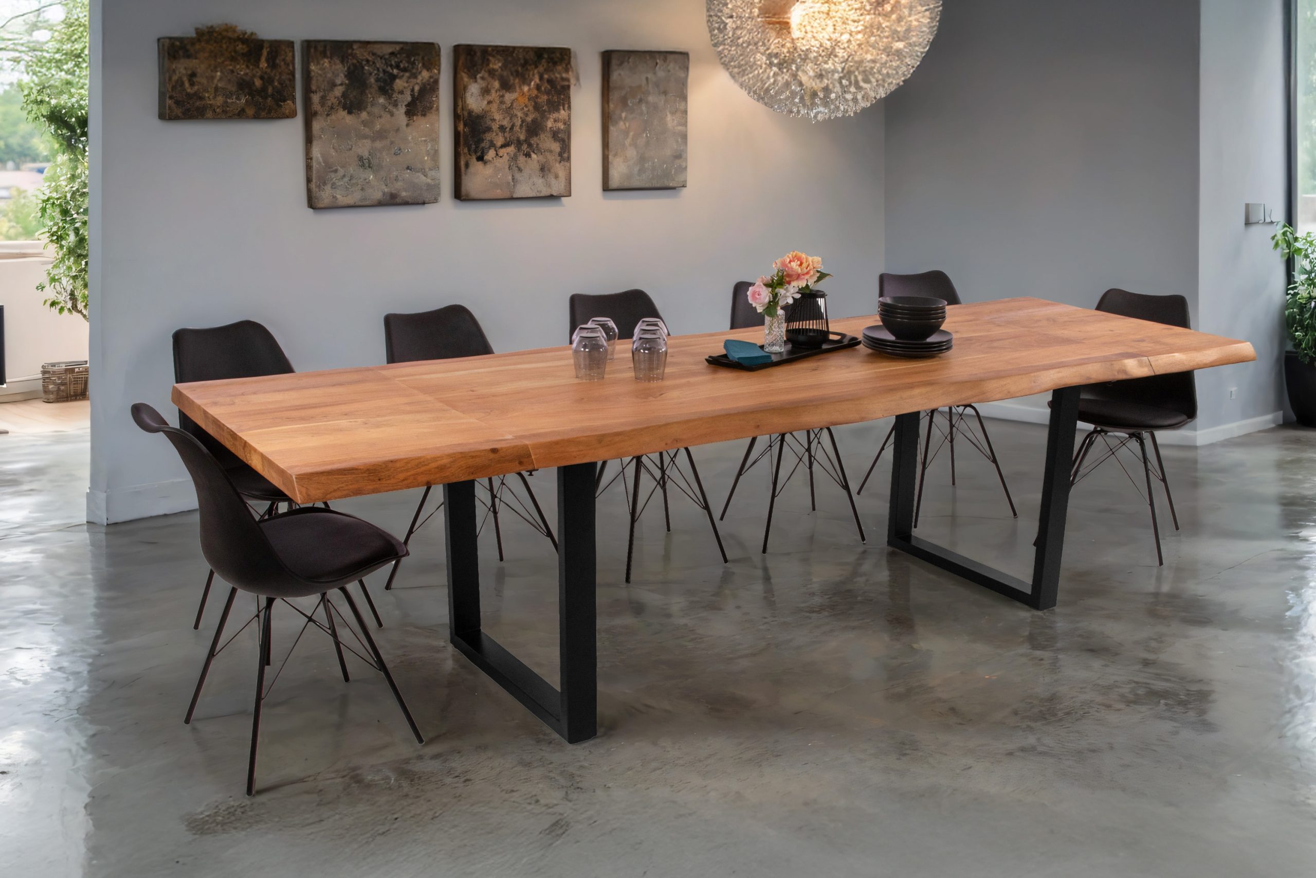 Esszimmertisch Cali mit Ansteckplatten | echte Baumkante | Akazienholz naturfarben + massiv | U-Gestell Metall schwarz | 220–320 x 100 cm