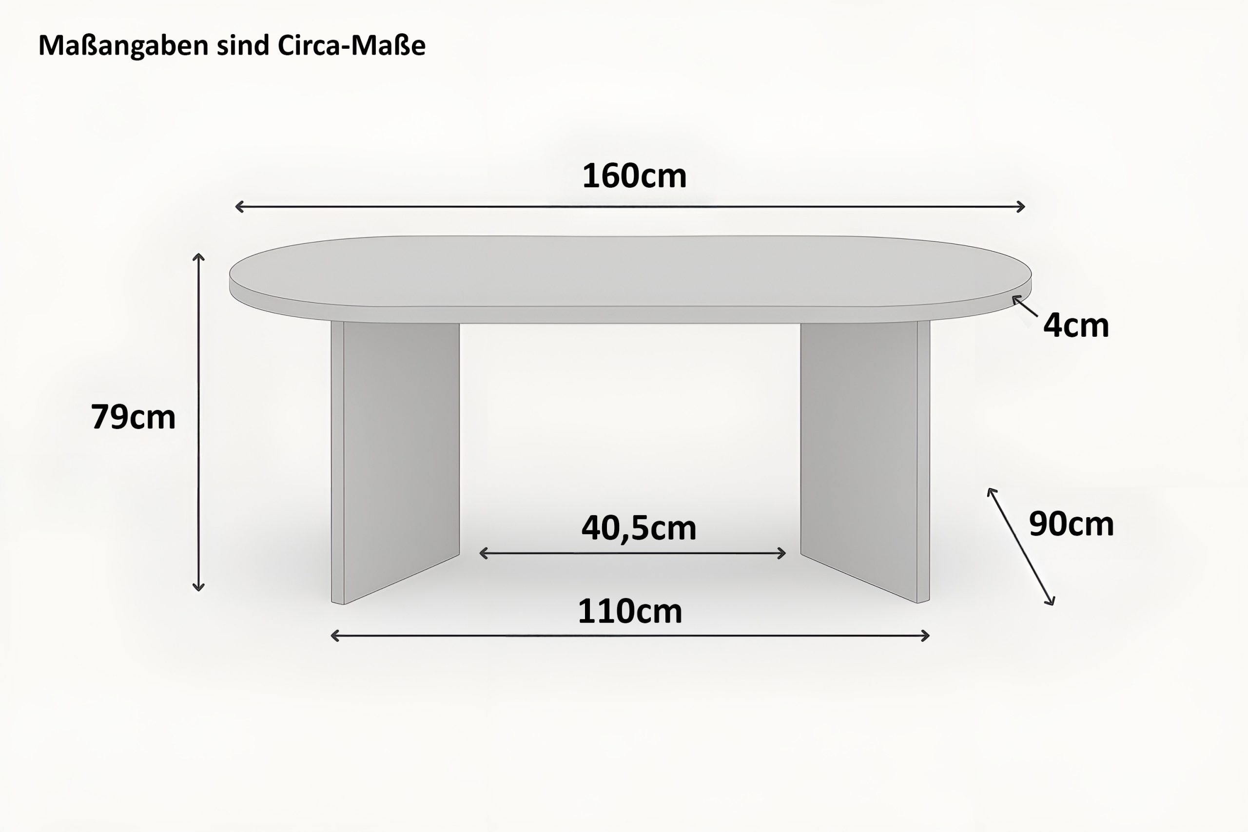 - Ovaler Tisch in der Größe 160 x 90 cm mit moderner Tischplatte.