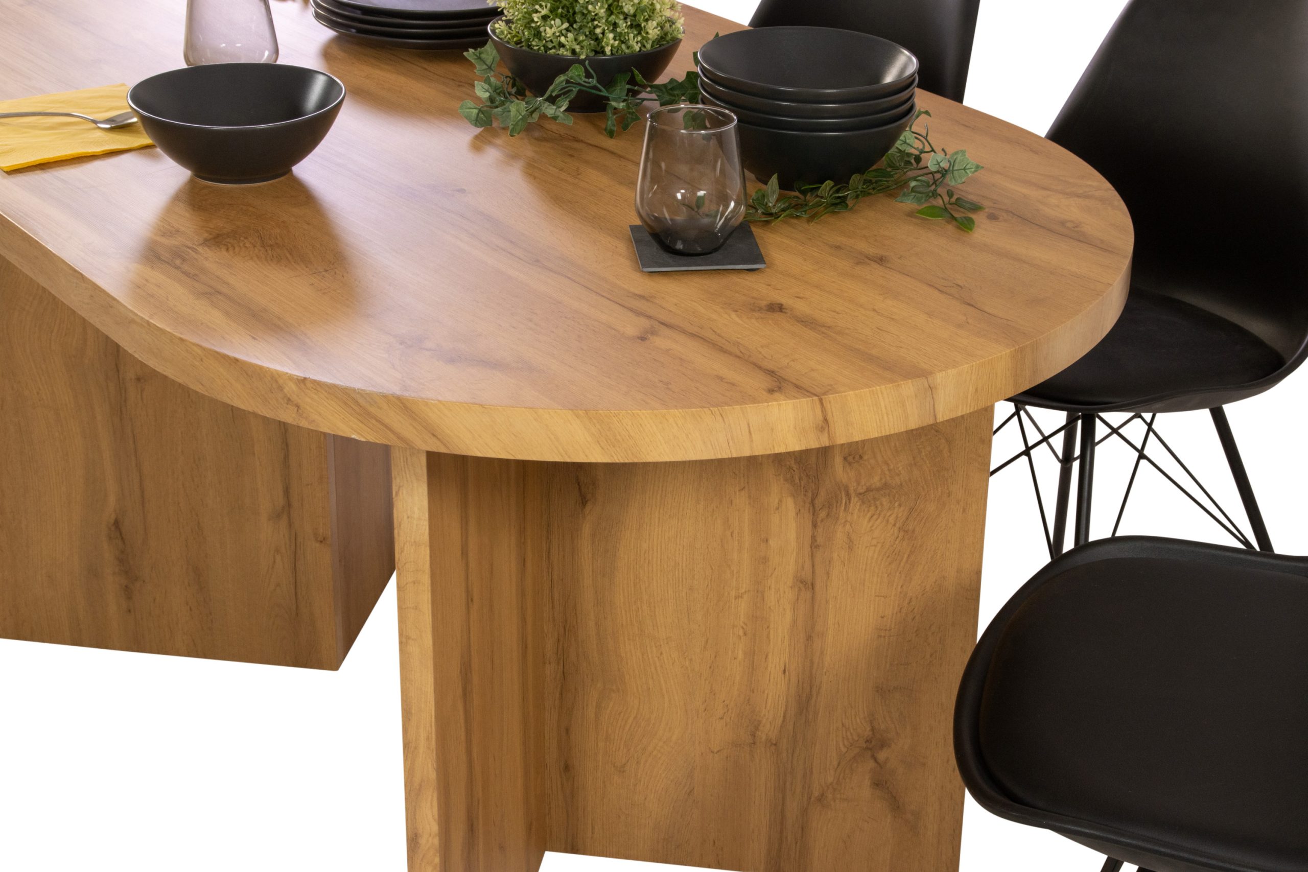 Die Kombination aus ovaler Tischplatte und klaren Linien des Gestells ergibt ein zeitloses Design, das sowohl funktional als auch optisch überzeugt. Die Tischplatte beeindruckt mit pflegeleichtem MDF, das auch bei Schwankungen in der Raumtemperatur formstabil bleibt. Für die Reinigung reicht ein feuchtes Tuch.