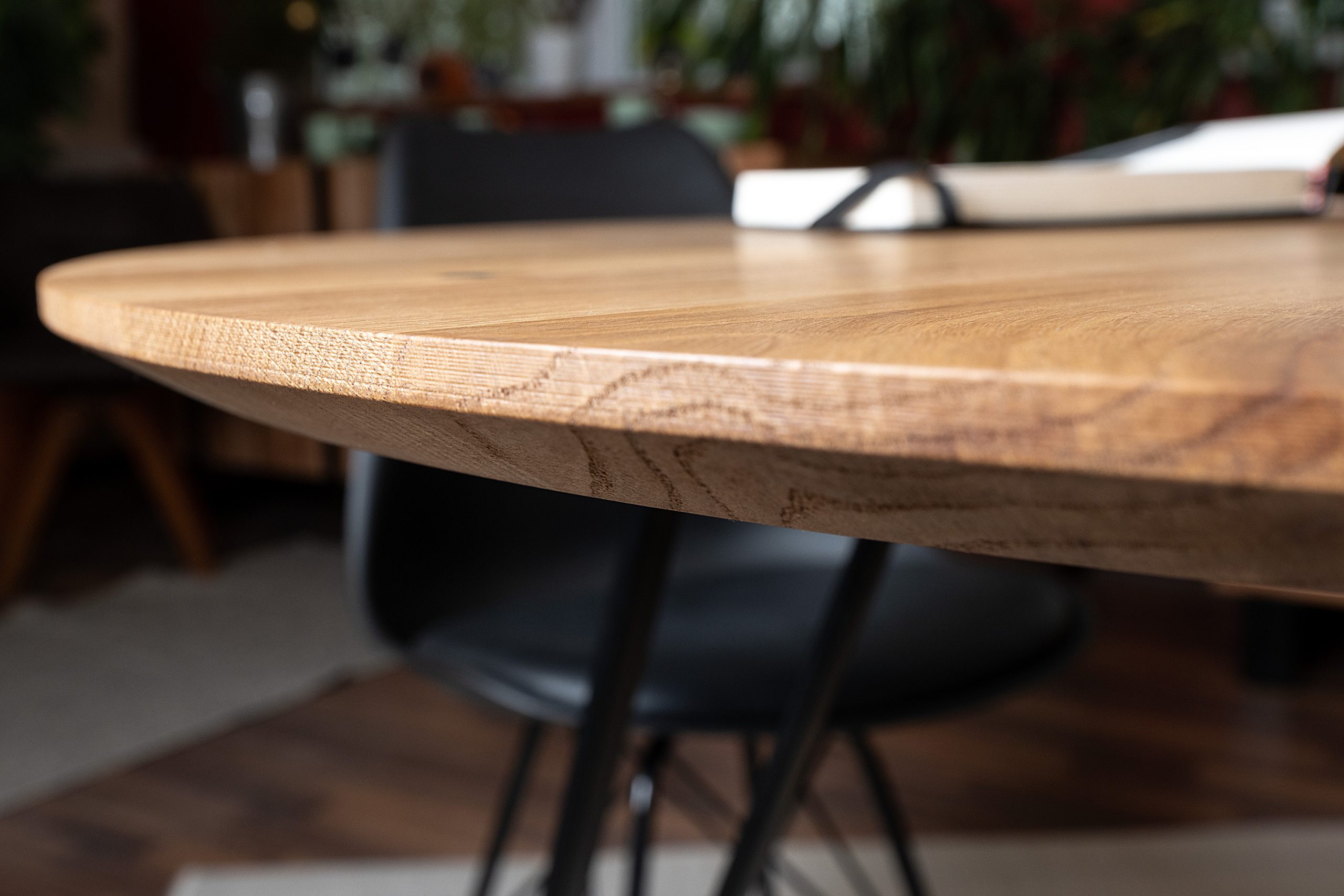 Runder Esstisch Dream, 90 cm rund, 26 mm Tischplatte, Eichenholz geölt, 3-Fuß-Hairpin-Gestell
