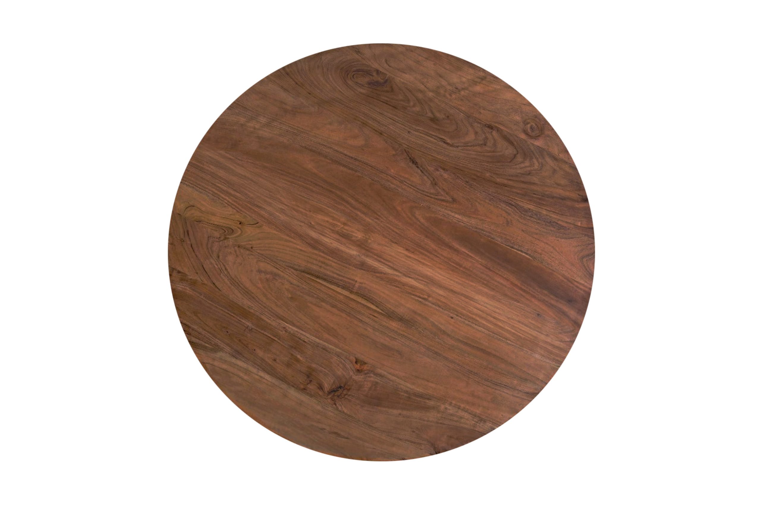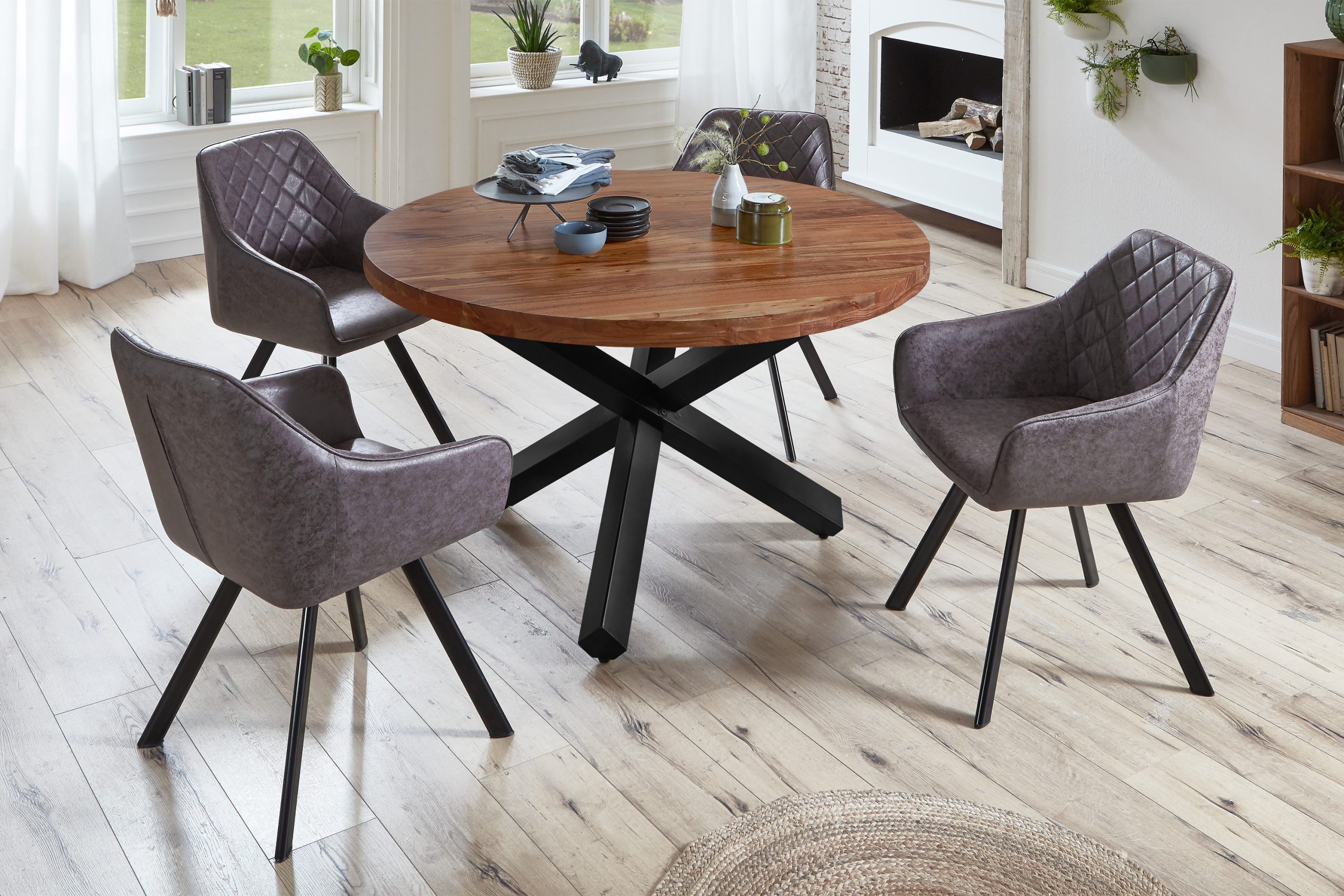 Der runde Esszimmertisch Runa vereint natürliche Materialien mit moderner Eleganz. Seine 50 mm starke Tischplatte aus massivem Akazienholz überzeugt nicht nur optisch durch ihre kräftige Erscheinung, sondern auch durch ihre enorme Stabilität. Jede Platte ist ein Unikat, das durch die individuelle Maserung einzigartig wirkt.