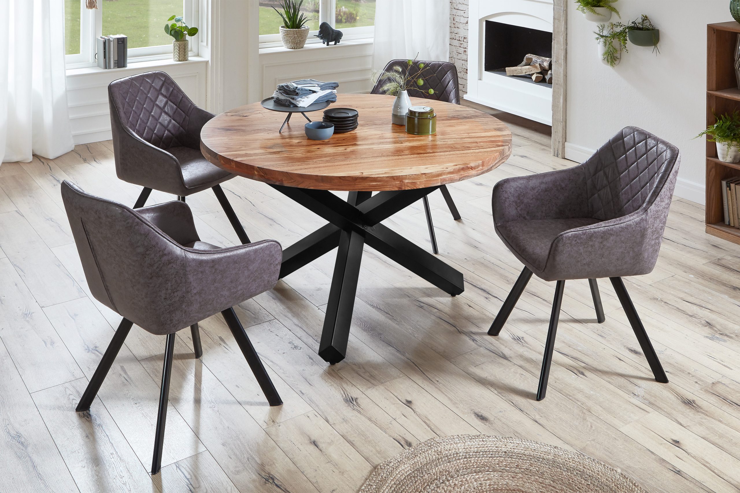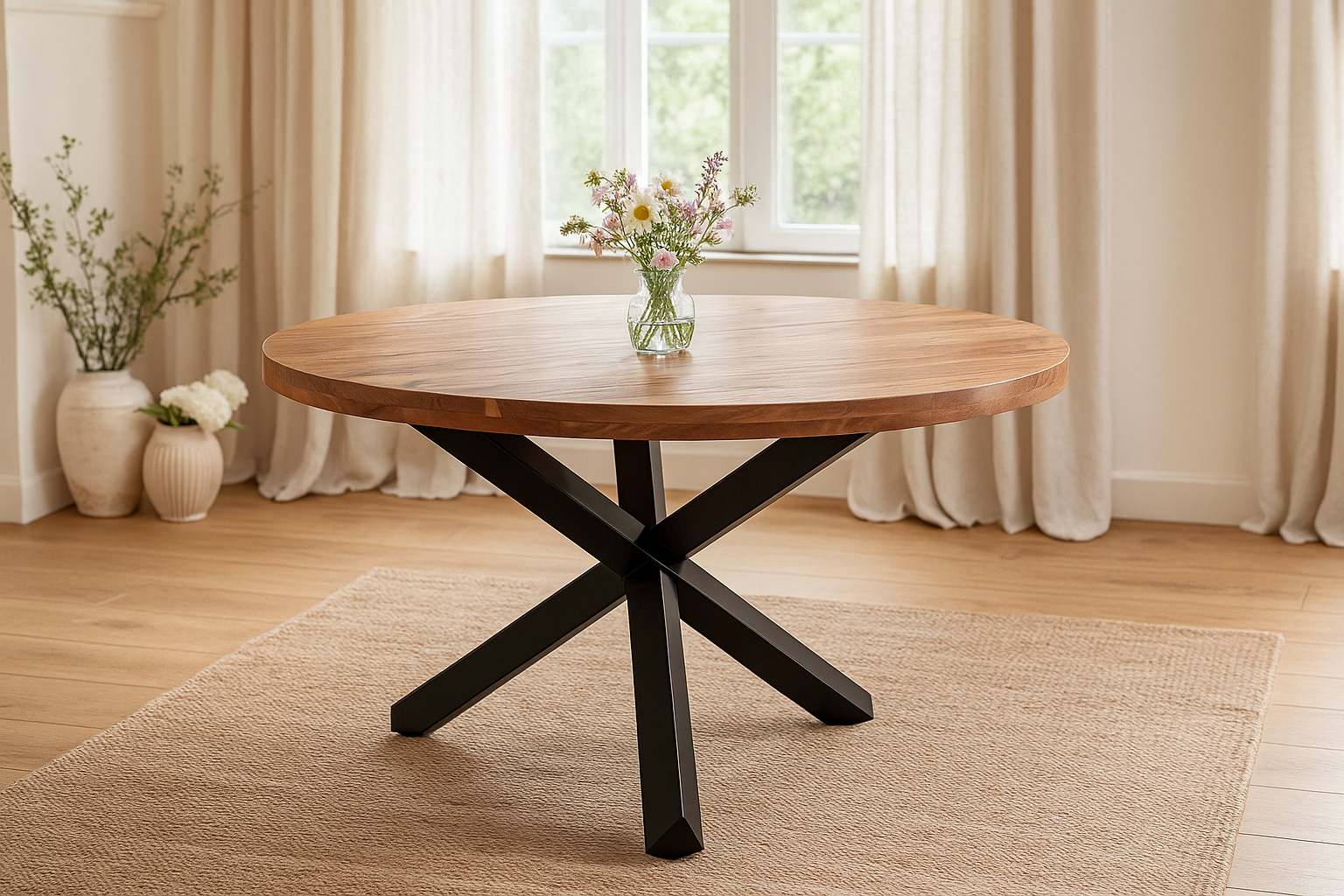 Der runde Esszimmertisch Runa vereint natürliche Materialien mit moderner Eleganz. Seine 50 mm starke Tischplatte aus massivem Akazienholz überzeugt nicht nur optisch durch ihre kräftige Erscheinung, sondern auch durch ihre enorme Stabilität. Jede Platte ist ein Unikat, das durch die individuelle Maserung einzigartig wirkt.