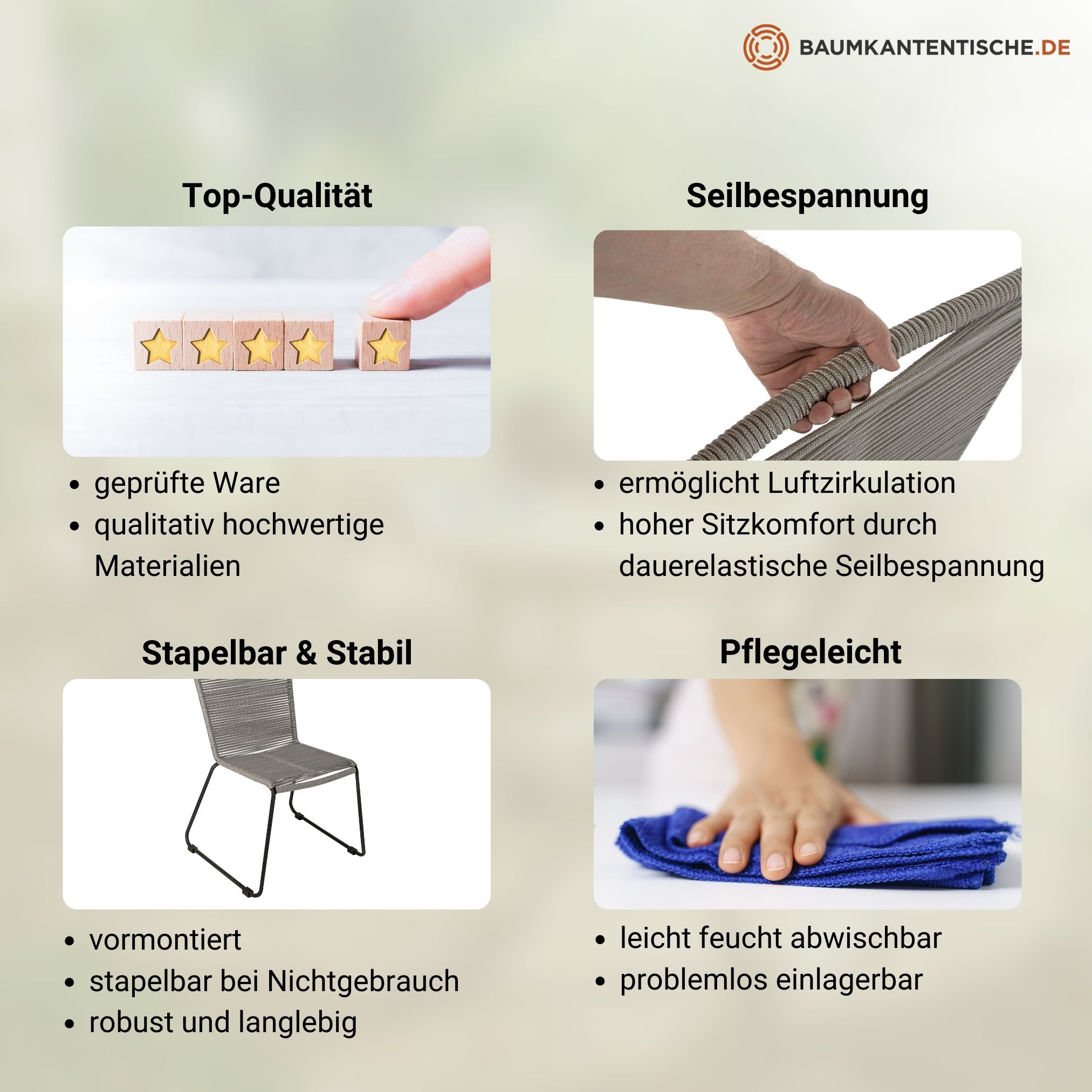 - Der pflegeleichte Seilstuhl in der Farbe Grau kann bei Nichtnutzung problemlos in einer Ecke, Garage oder Kammer gestapelt aufbewahrt werden.