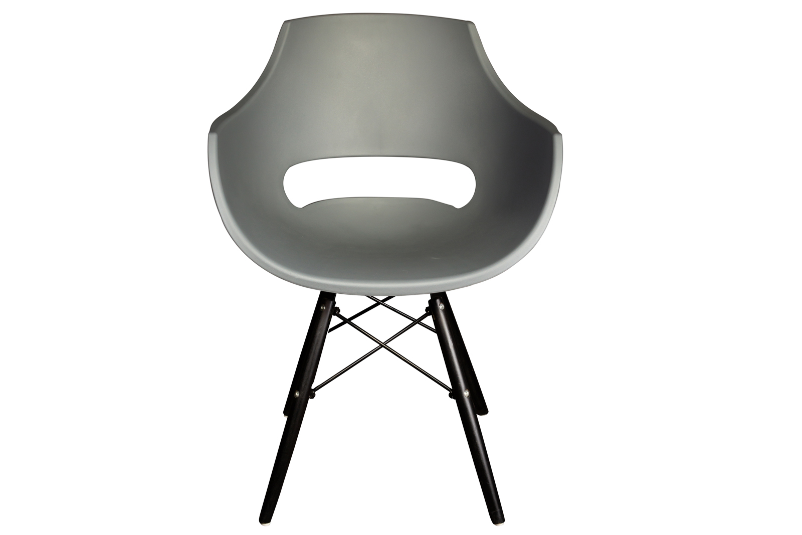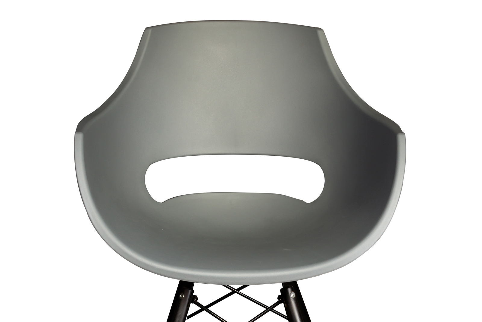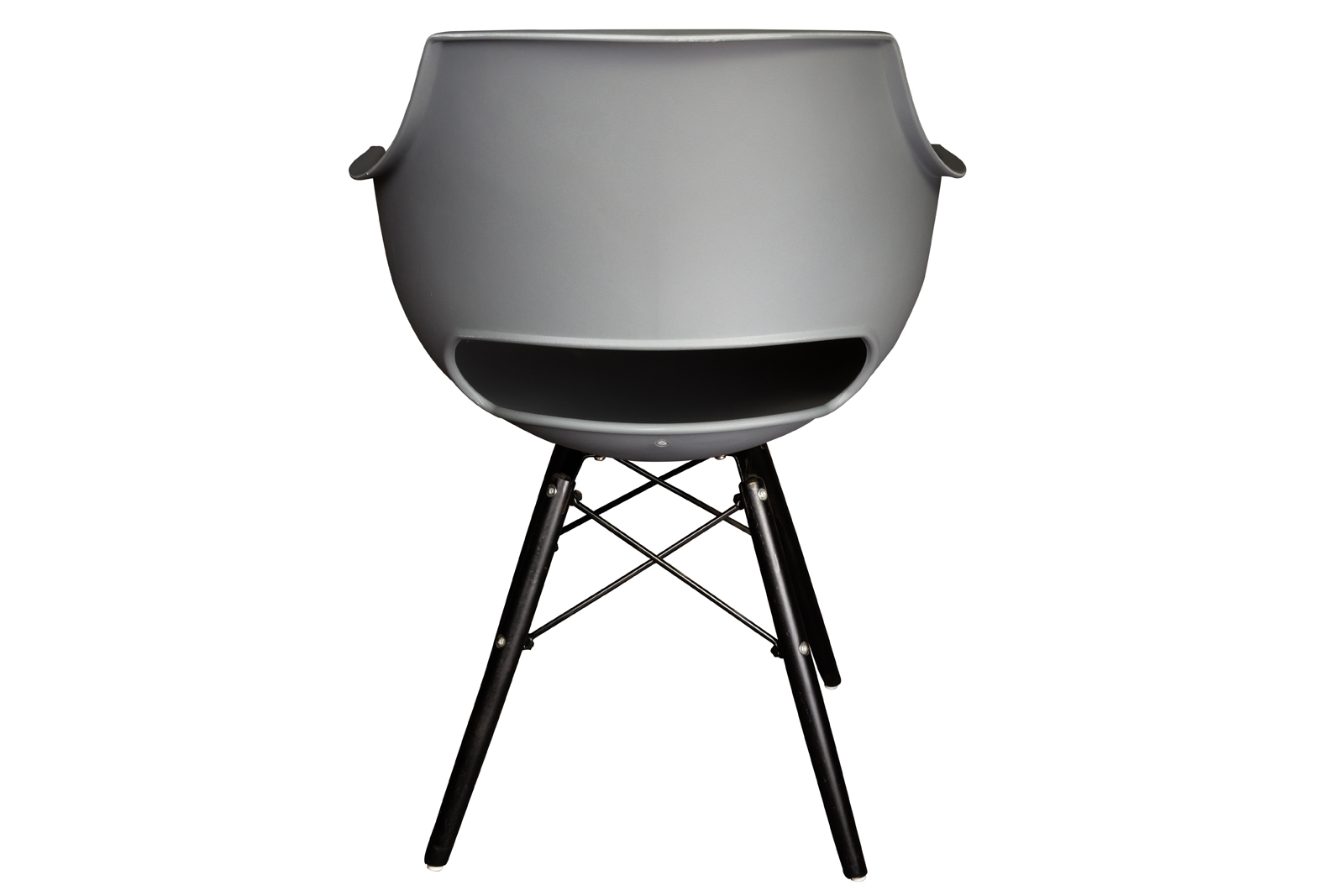 - Graue, hochwertige Sitzschale aus Kunststoff mit einem massiven Holzgestell in schwarz