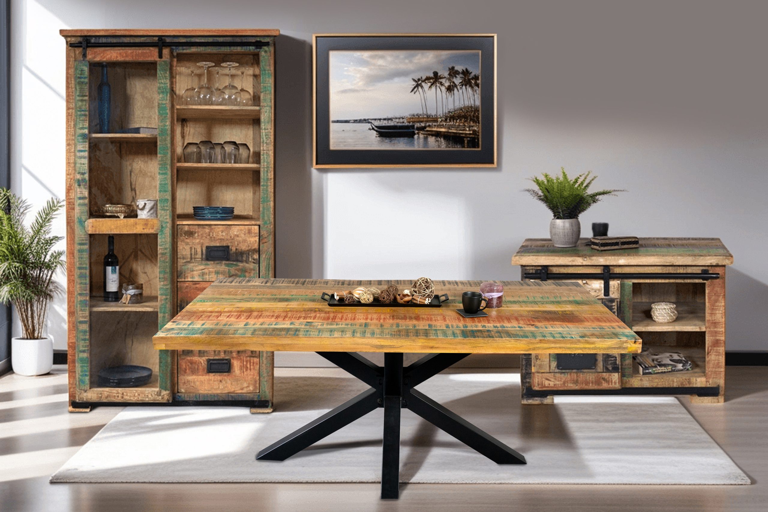- Der 160×85 cm große Esszimmertisch aus Mangoholz besitzt eine massive & bunt lackierte Tischplatte mit rauer Oberfläche im Used-Look.