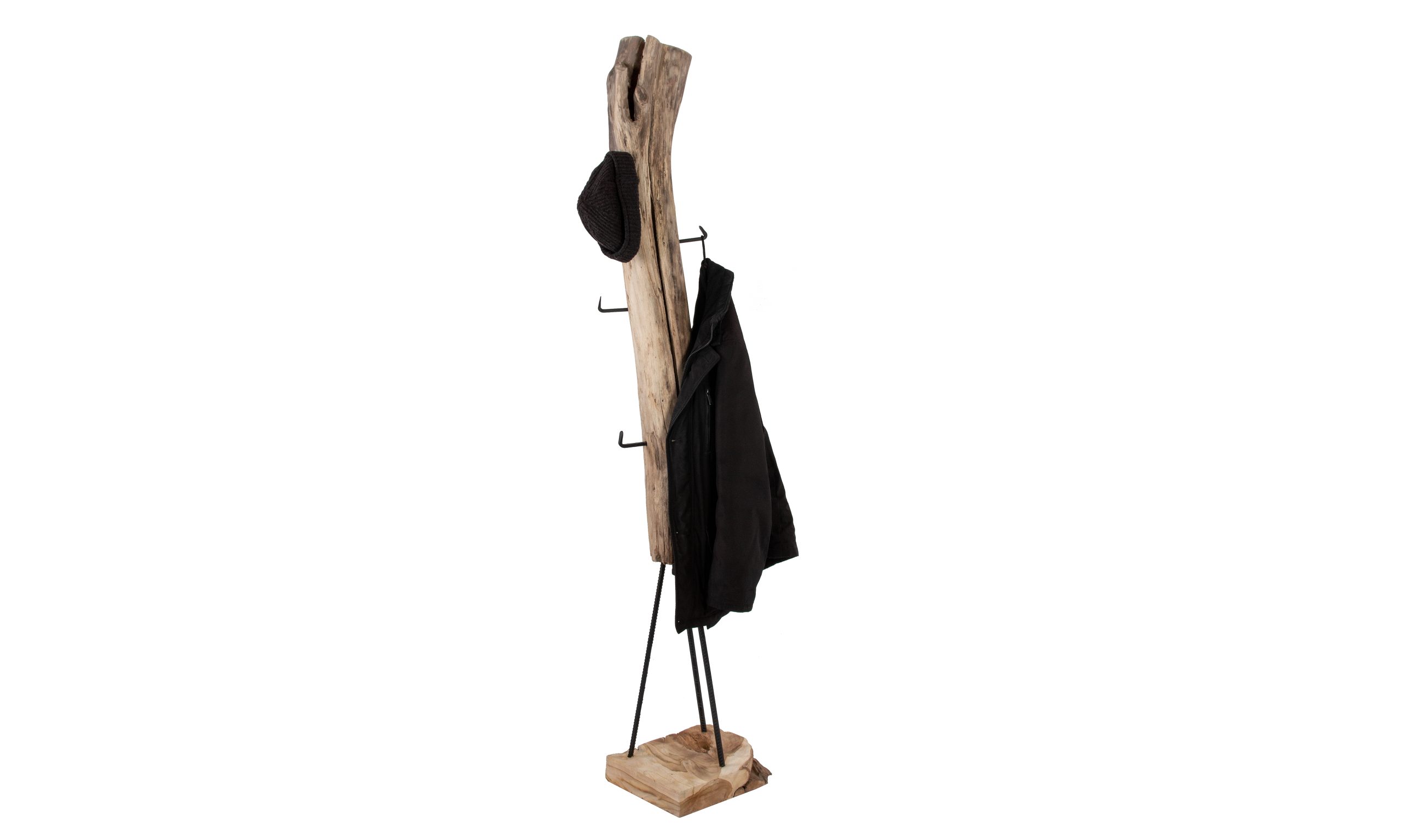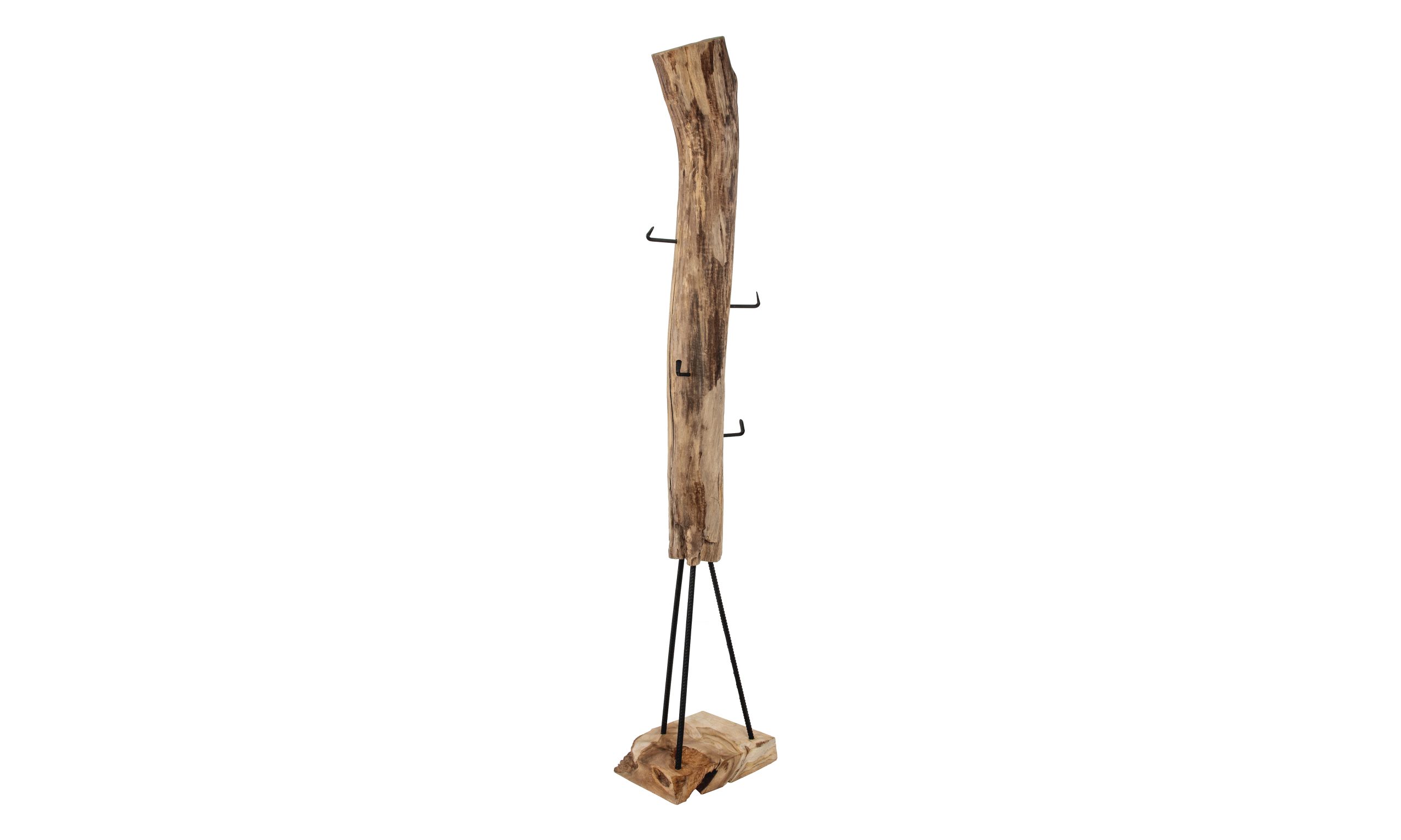 Jede Garderobe ist aufgrund seines natürlichen Wuchsverlaufs ein Unikat, ihre Maserung, Größe und Form kann daher leicht von den Bildern abweichen. Durch das massive Teakholz mit Metallstangengestell und den stabilen Sockel wackelt die Garderobe auch unter Last nicht.