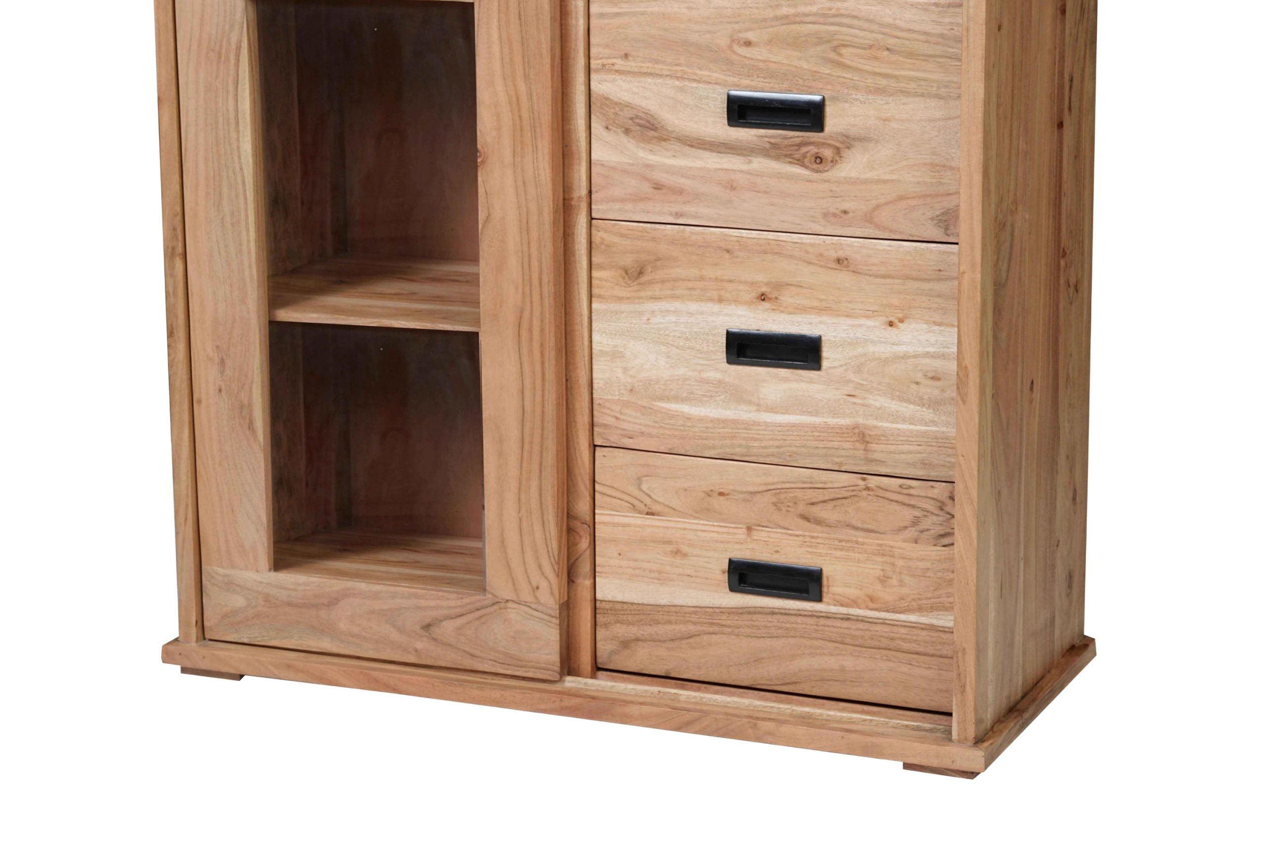 Das Highboard aus massivem Akazienholz in Natur vereint natürliche Schönheit mit industriellen Akzenten. Durch die einzigartige Maserung wird jedes Möbelstück zu einem Unikat, das Wärme und Stil in Ihr Zuhause bringt.